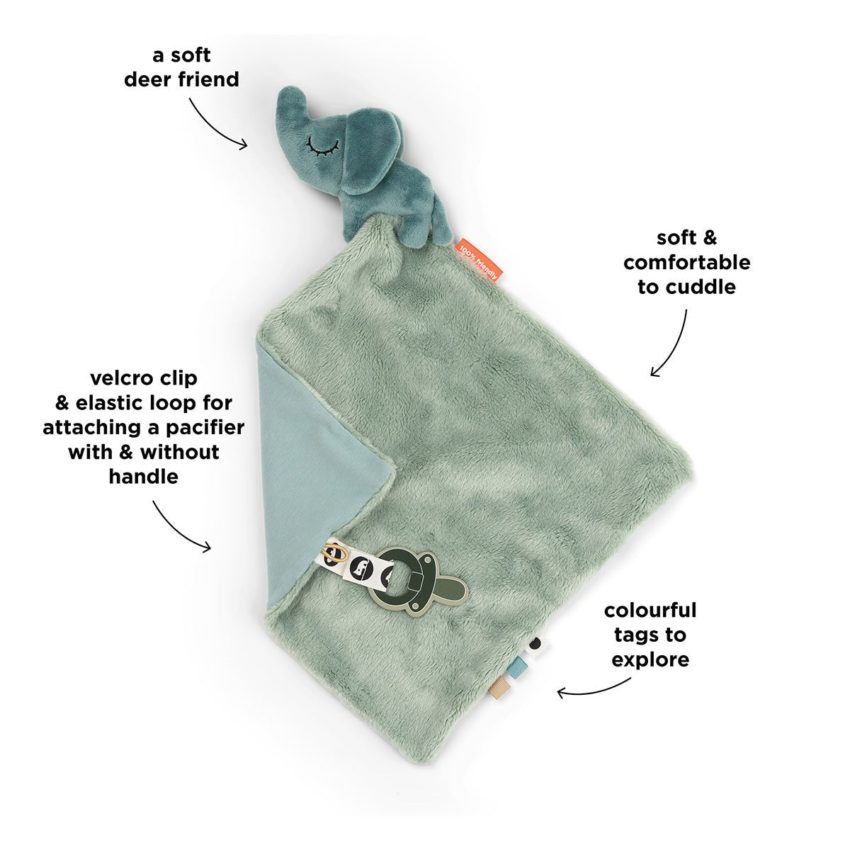 Kleine handjes ontdekken de wereld door aanraking, en de sensorische labeltjes stimuleren zintuiglijke ontwikkeling en fijne motoriek. Dankzij de slimme velcro-clip blijft de fopspeen altijd binnen handbereik, wat deze baby comfort blanket ideaal maakt voor newborns en kleintjes. Dit blauw knuffeldoekje met olifanten knuffeltje is niet alleen een vriendje voor nu, maar groeit mee en blijft een vertrouwd speeltje tijdens de hele kindertijd.