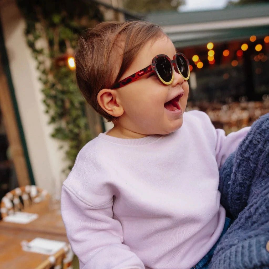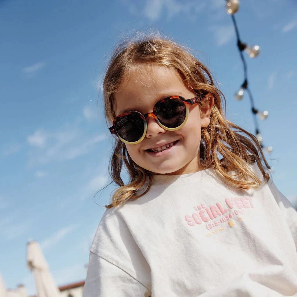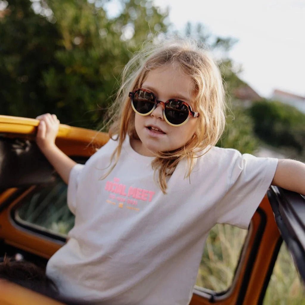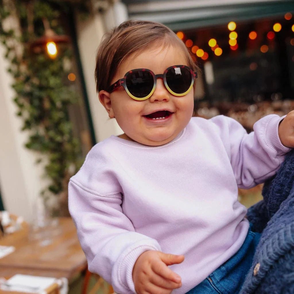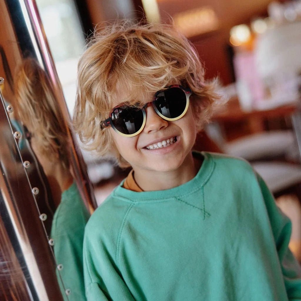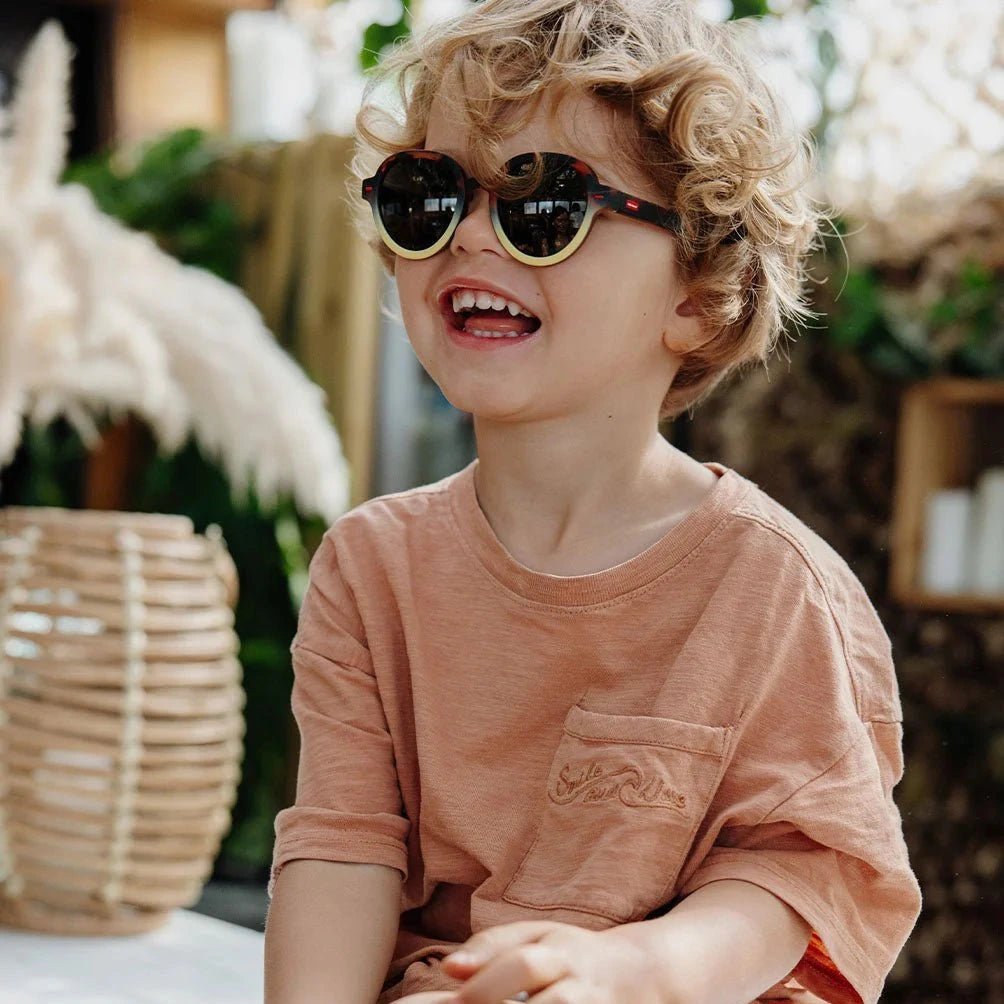 Megy Craky Yellow zonnebrillen voor baby's en kinderen maken elke zonnige dag stijlvol en nog aangenamer. Deze designer zonnebrillen ontworpen in Frankrijk door Hello Hossy zijn geschikt voor jongens en meisjes en kan je een heel jaar door dragen.