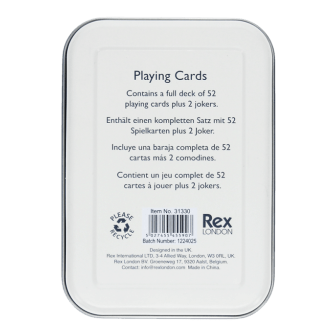 Klaar voor een potje kaarten? Deze unieke kaartenset in blikken doosje Dog Park van Rex London wordt geleverd in een stijlvol metalen blikje en is voorzien van onze schattige Dog Park-print aan de achterzijde van deze klassiek boek kaarten.