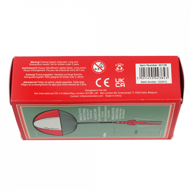Het ontwerp is tijdloos en kleurrijk genoeg om nieuwsgierigheid op te wekken, zonder opdringerig te zijn. De parachutist om in de lucht te gooien komt in een mooi geïllustreerd doosje. Een klein stukje magie dat je eenvoudig kunt meenemen naar de tuin, het park of zelfs binnen. Perfect voor kinderen én volwassenen die het plezier van simpele wonderen waarderen.