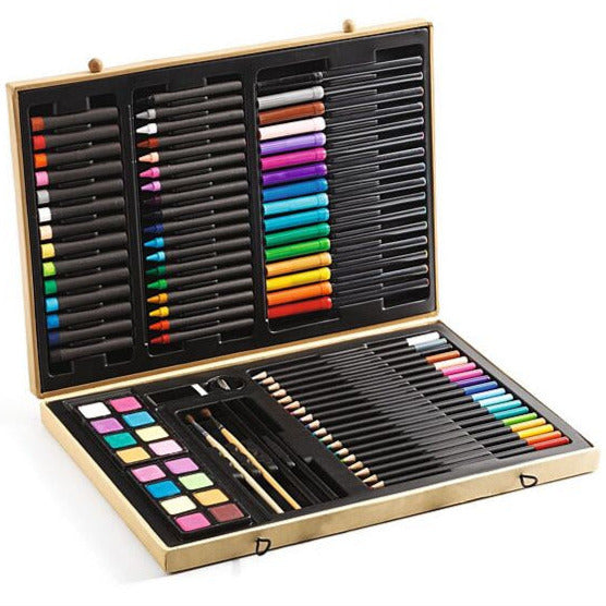Deze goedgevulde koffer Big Box van het Franse Djeco bevat materiaal van prima kunstkwaliteit en biedt beginnende kunstenaars de mogelijkheid om verschillende technieken te leren: pastels, tekeningen, gouaches... alles is aanwezig!