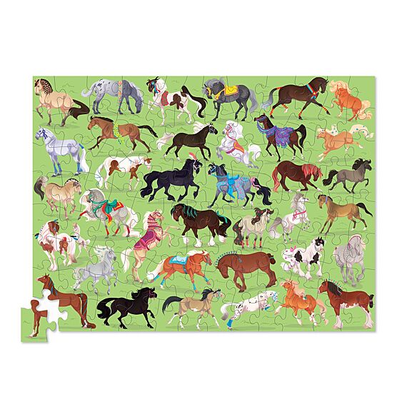 Met deze prachtige geïllustreerde puzzel uit de reeks 36 Animals ontdekken kinderen spelenderwijs het dierenrijk. De 100-delige puzzel toont 36 verschillende paardenrassen en zit verpakt in een handig tonnetje. Leuk en leerzaam! Met de ingesloten legende leer je ze allemaal kennen: van het Friese paard tot aan de IJslander. Alle puzzels van Crocodile Creek zijn gemaakt van 100% gerecycled karton en geprint met inkt op soja- en waterbasis. Een leuk en leerzaam geschenk voor kinderen vanaf 5 jaar. Inclusief meertalige legende