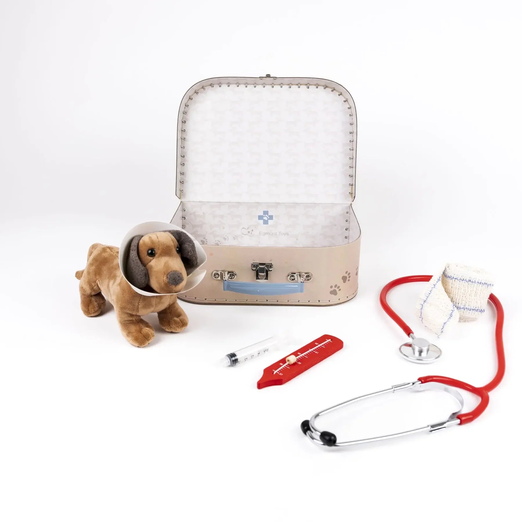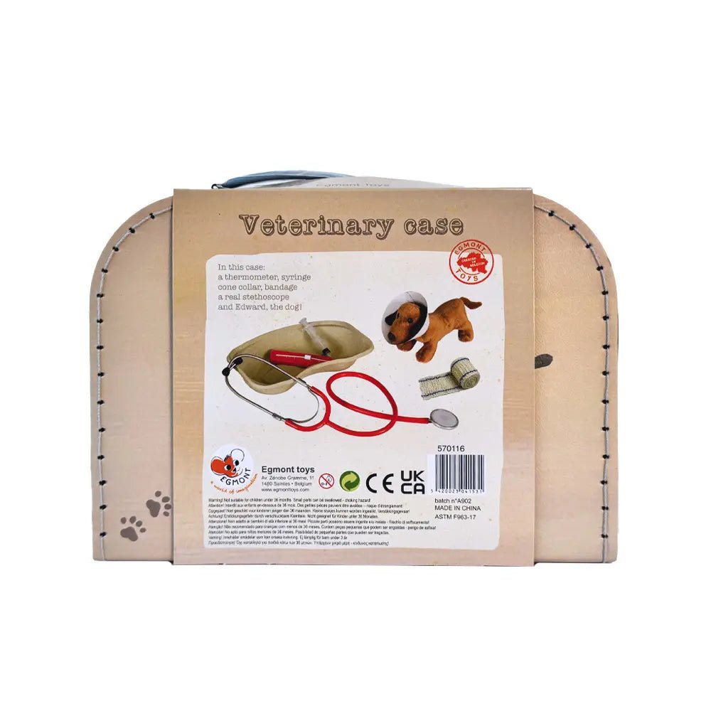 Heeft je knuffel een check-up nodig? Kleine dierenartsen kunnen met de echte stethoscoop luisteren, zijn temperatuur opnemen en zijn pootje voorzichtig verbinden dankzij dit dierenarts koffertjev van het Belgische Egmont Toys met speelgoed intrumenten.