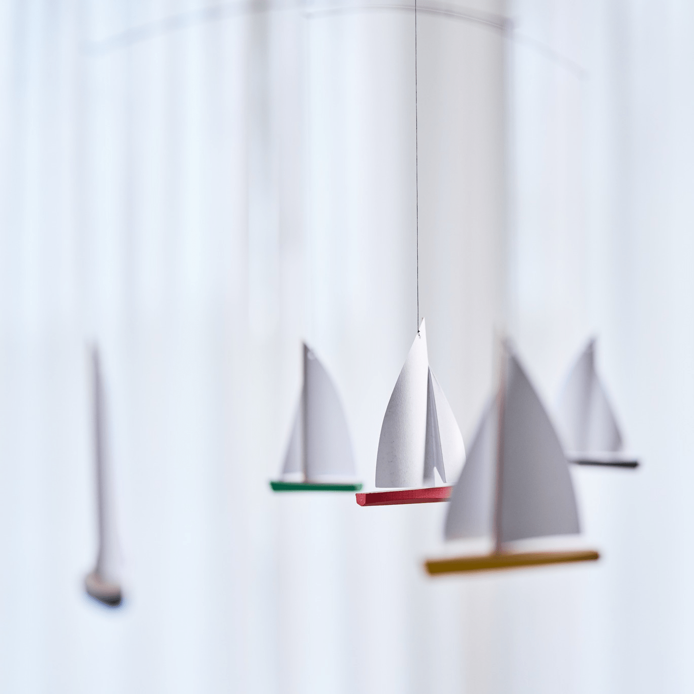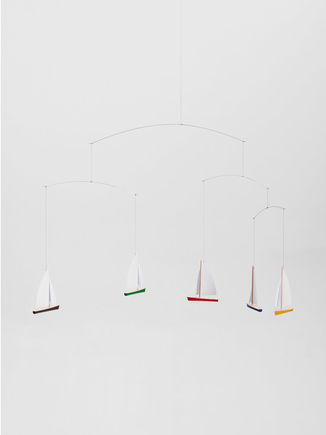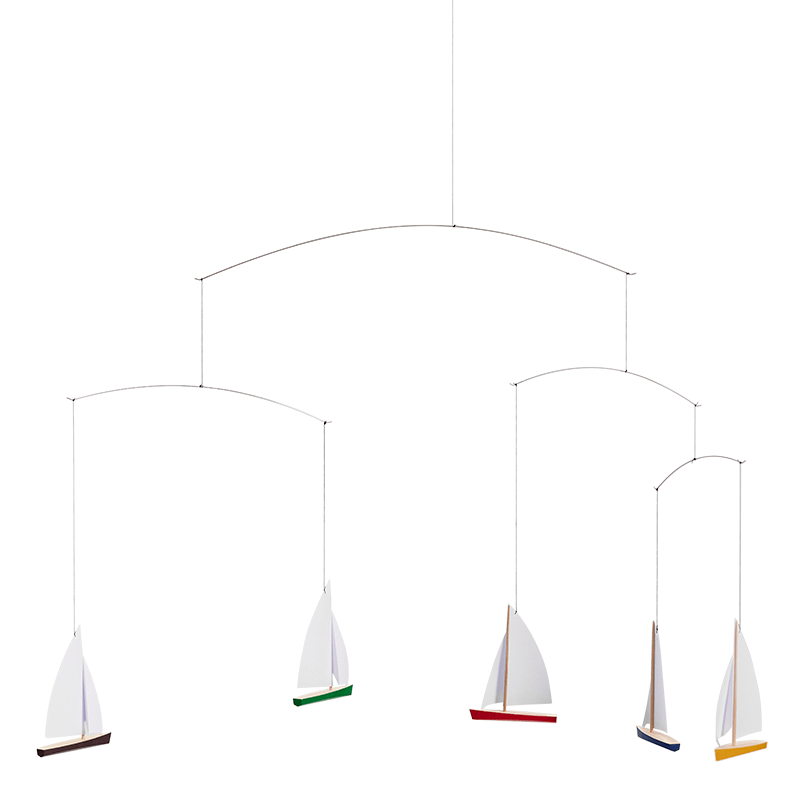 Voeg persoonlijkheid toe aan je kinderkamer - of eigen slaapkamer - met de Flensted Mobiel N°27 Dinghy Regatta 5.  Dit is bijna een hypnotiserende decoratie, ontworpen in 1964, brengt de vreugde van het zeilen in elke kamer van je huis met zijn hoogwaardige houten zeilbootjes in vrolijke kleurtjes.