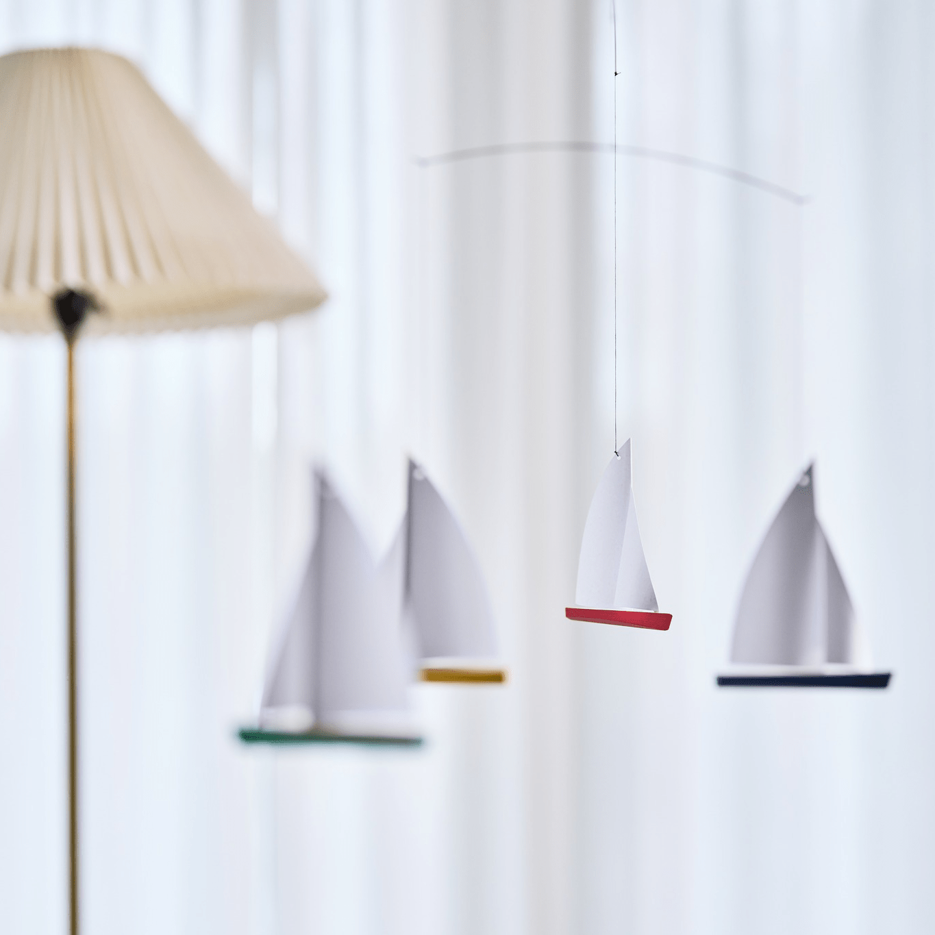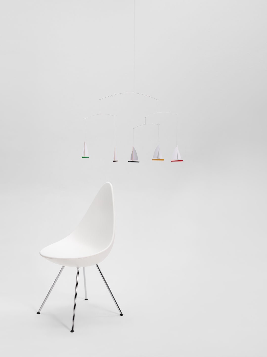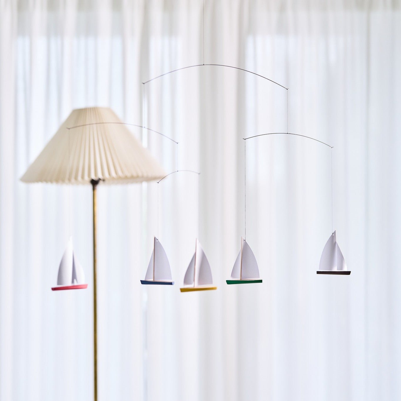 Voeg persoonlijkheid toe aan je kinderkamer - of eigen slaapkamer - met de Flensted Mobiel N°27 Dinghy Regatta 5.  Dit is bijna een hypnotiserende decoratie, ontworpen in 1964, brengt de vreugde van het zeilen in elke kamer van je huis met zijn hoogwaardige houten zeilbootjes in vrolijke kleurtjes.