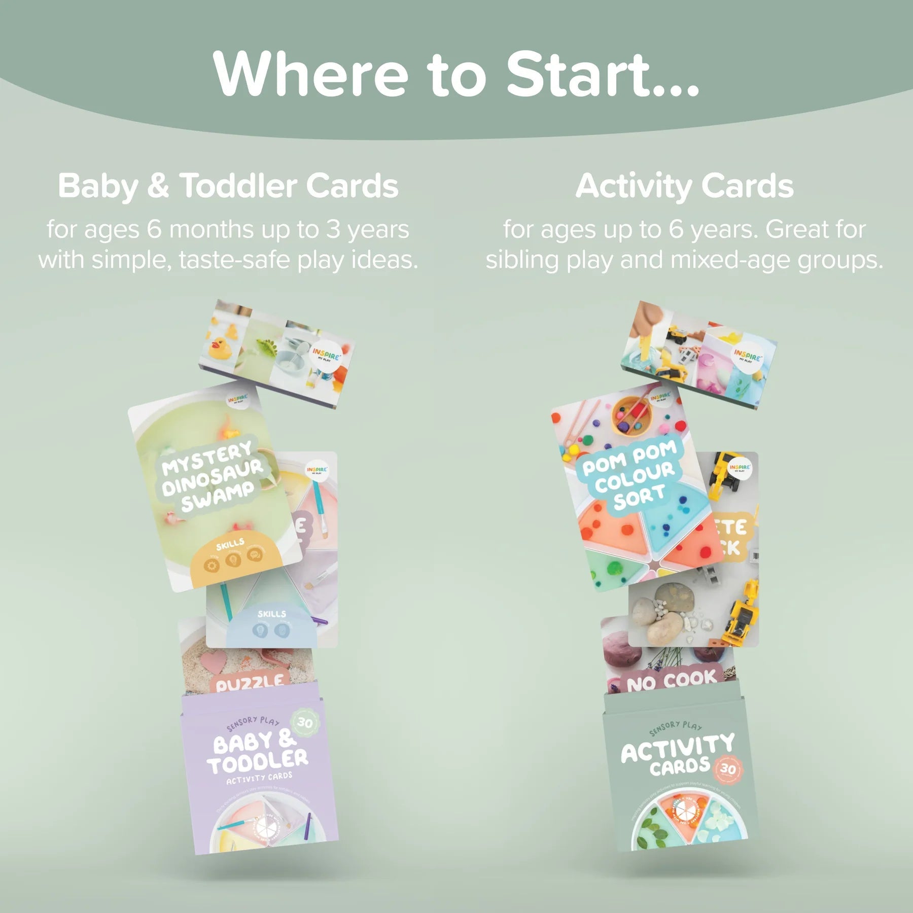 Deze collectie bestaat uit 30 extra grote, stevige activiteitenkaarten en zit boordevol creatieve speelideeën, elk met een eenvoudig stappenplan voor het opzetten en spelen. Zie het als een kookboek met speelrecepten, klaar voor gebruik wanneer je sensorisch spel en open ended play wil initiëren! De activiteiten zijn origineel, veelzijdig en geschikt voor kinderen van 2 tot 6 jaar, waardoor ze perfect zijn voor gezinnen met meerdere kinderen, voor op kinderfeestjes of een groep met kinderen van verschillende leeftijden.