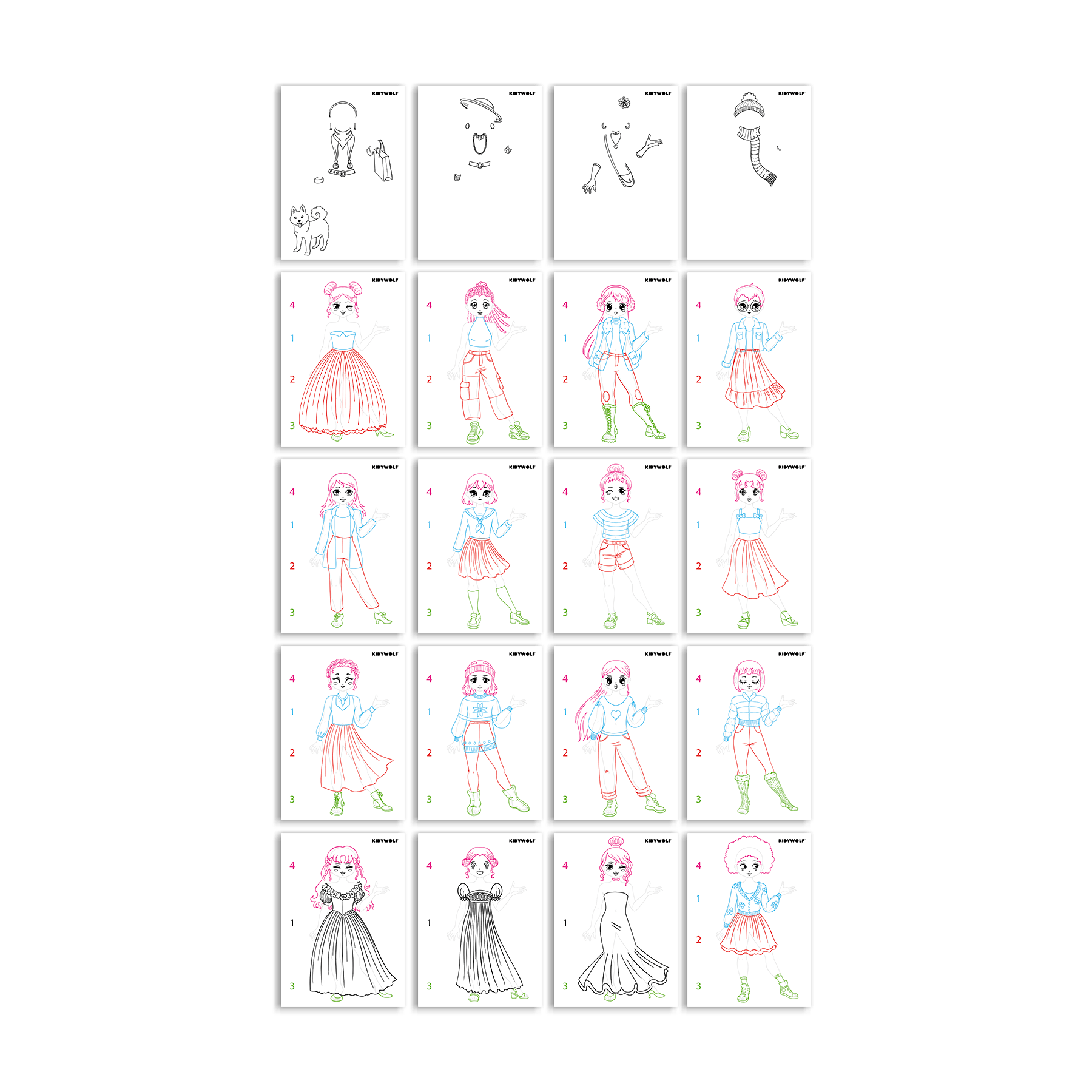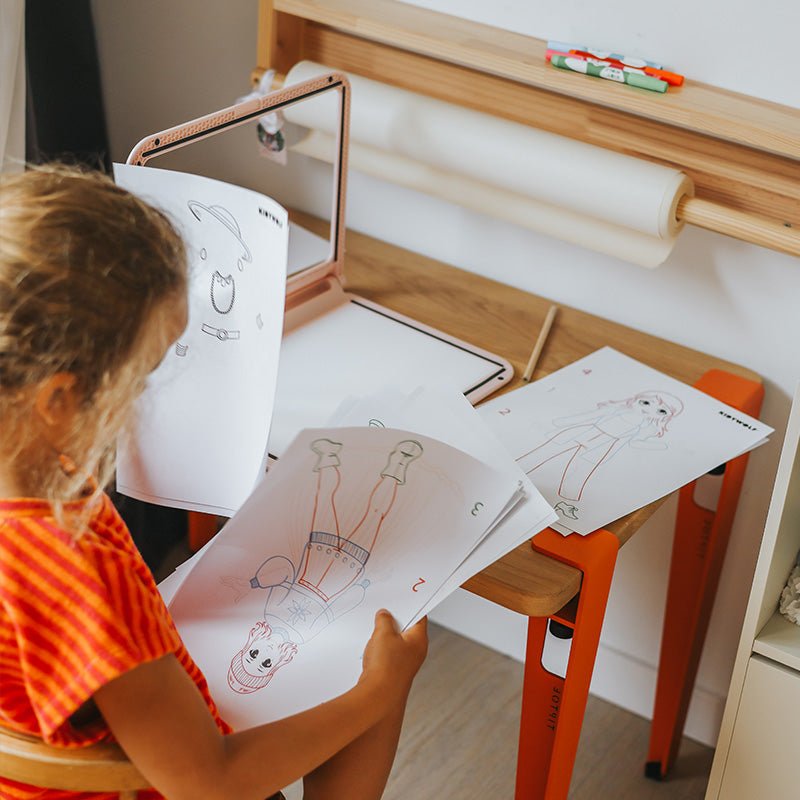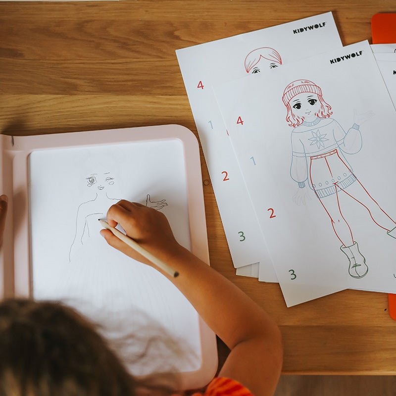 Met KIDYDRAW PRO worden kinderen echte stylisten in spe. Dankzij een ingenieus systeem van kleurplaten om over te tekenen kunnen ze silhouetten, outfits, accessoires en looks eindeloos combineren – meer dan 1000 combinaties zijn mogelijk, net als in een echt modeatelier.