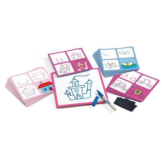 Stap voor stap leren tekenen met deze Djeco Tekenset Eduludo Step By Step Joséphine and co. Met 24 voorbeeldkaarten om je kind stap voor stap te begeleiden om sprookjesachtige tekeningen te maken. Je kan zo vaak opnieuw beginnen als je zelf wil dankzij de uitwisbare stift.