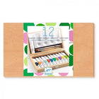 • Een mooie houten doos met 12 tubes plakkaatverf, 3 kwasten en 1 schilderspalet