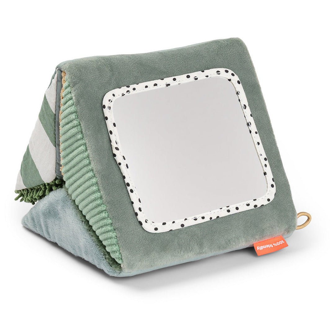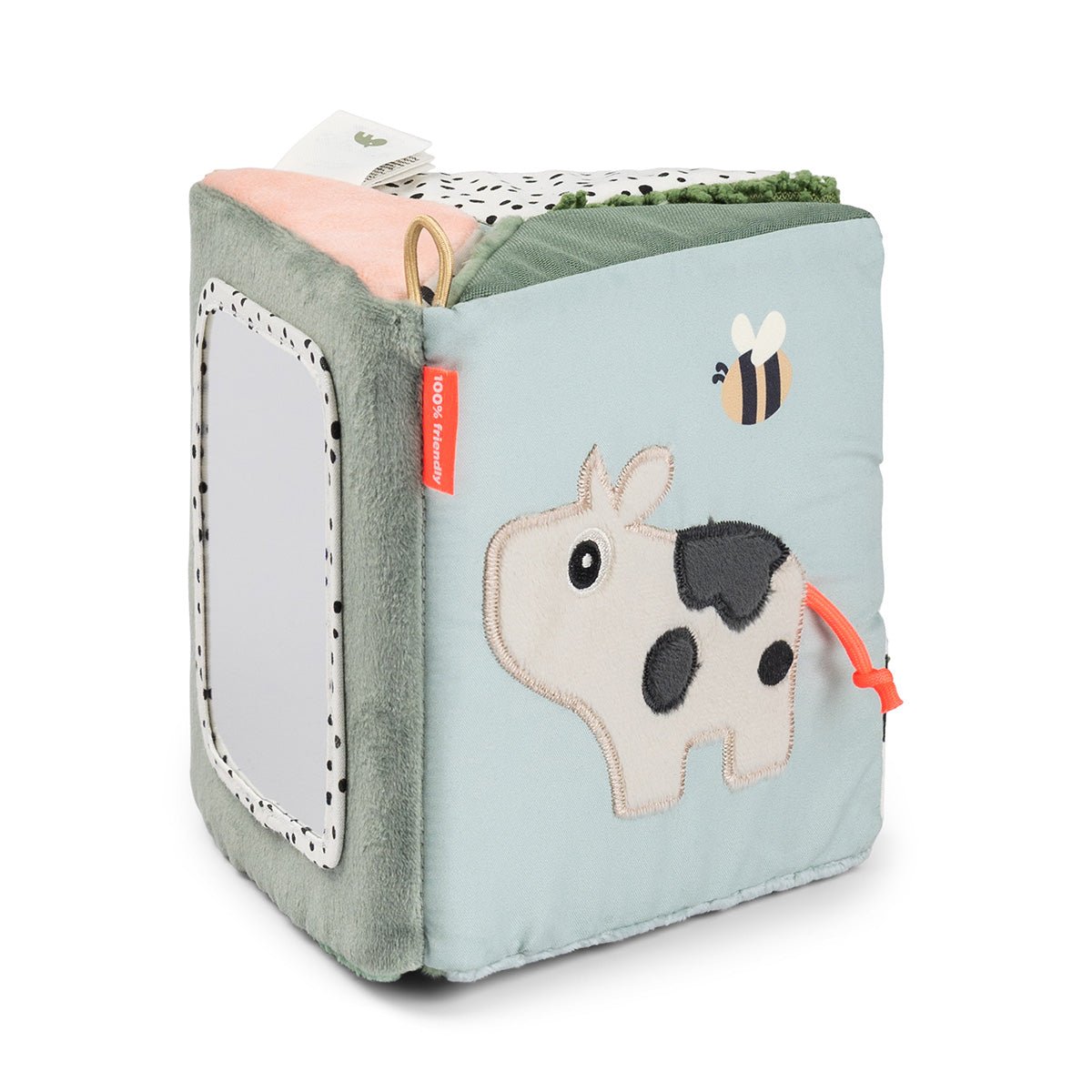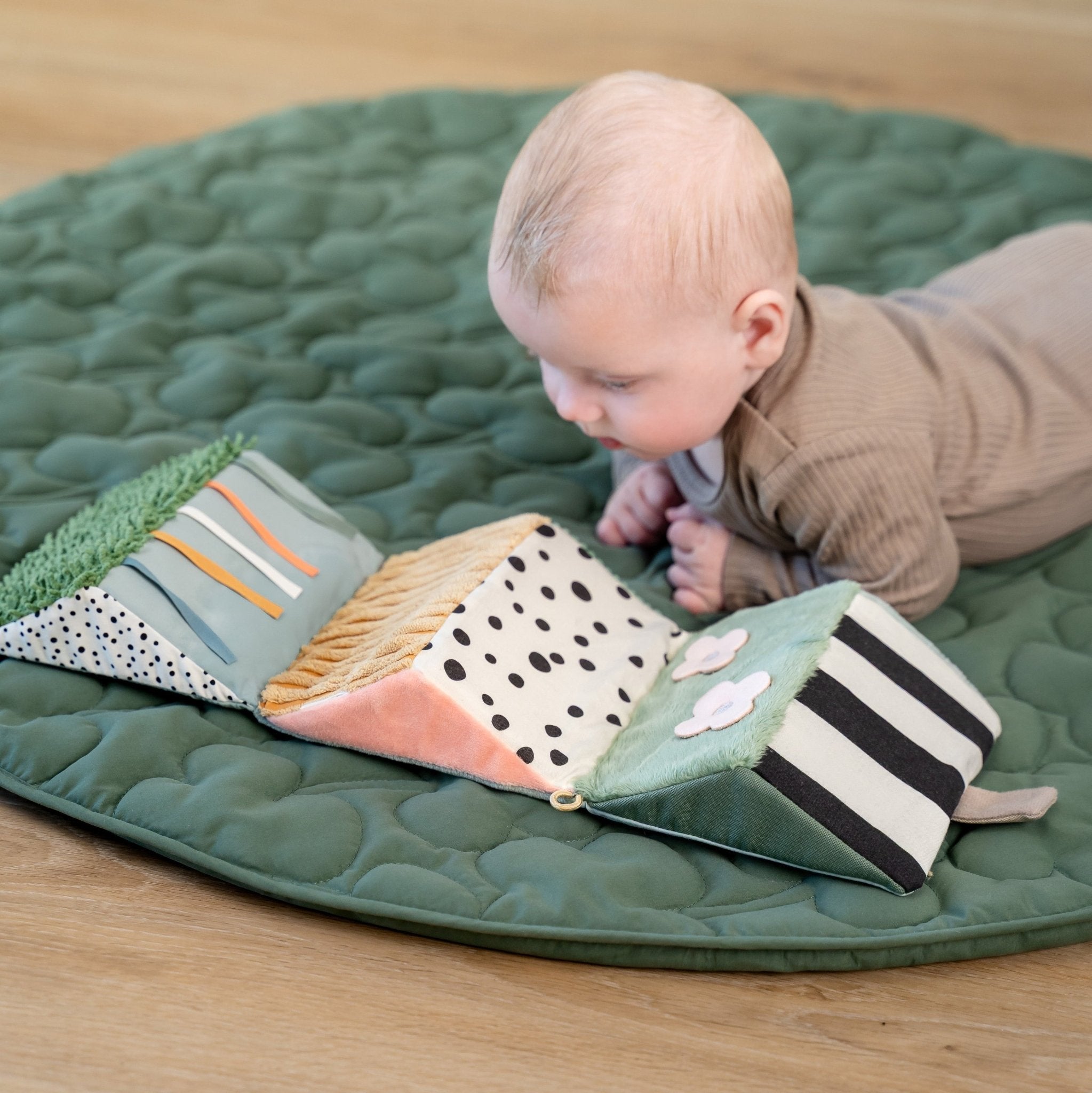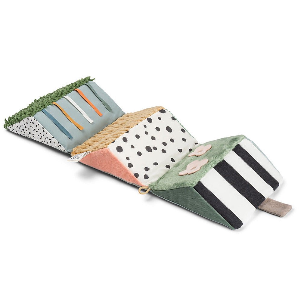 Dankzij het opvouwbare ontwerp kun je hem plat neerleggen voor buiktijd oftewel tummy time, als driehoek laten staan of ophangen waar je kleintje speelt. De felle prints, vriendelijke gezichten en zachte texturen zijn ideaal om de aandacht van baby’s te trekken en hen uit te nodigen om te kijken, aanraken en ontdekken.