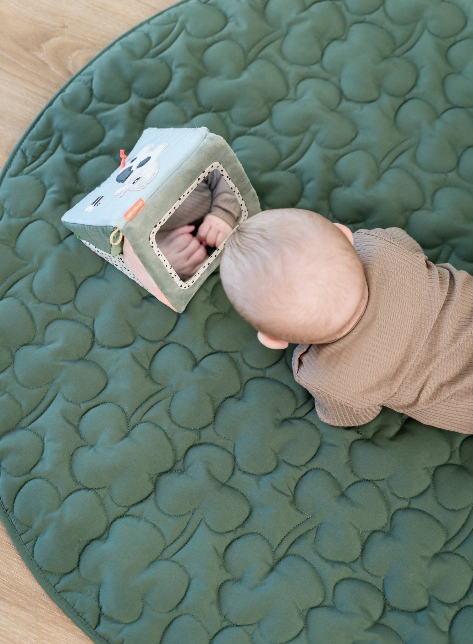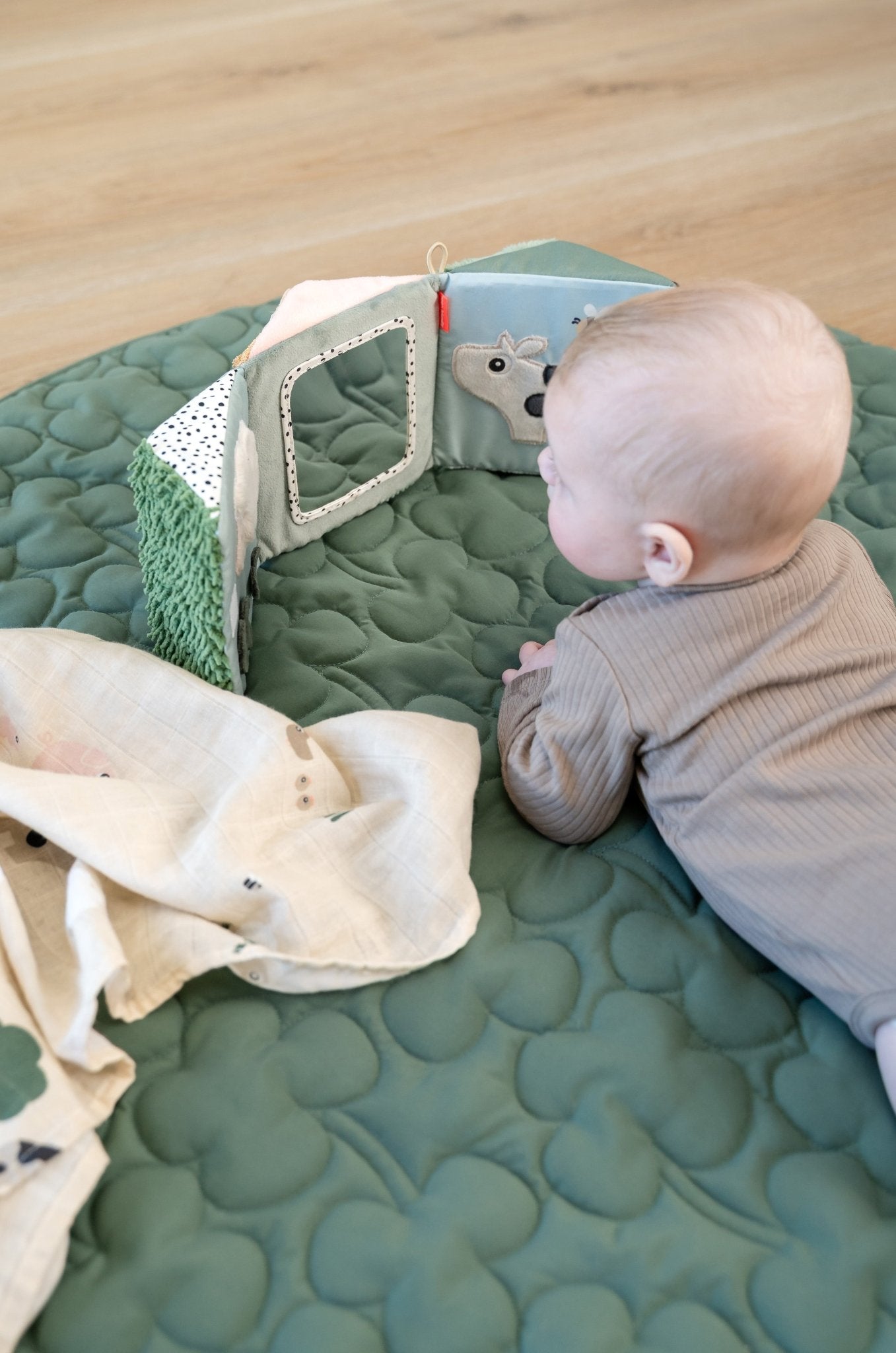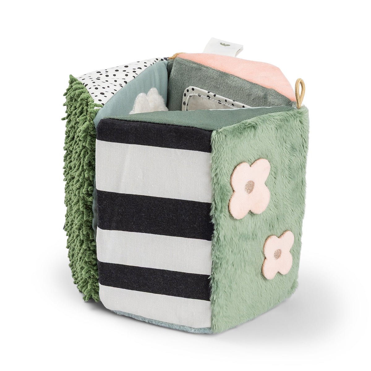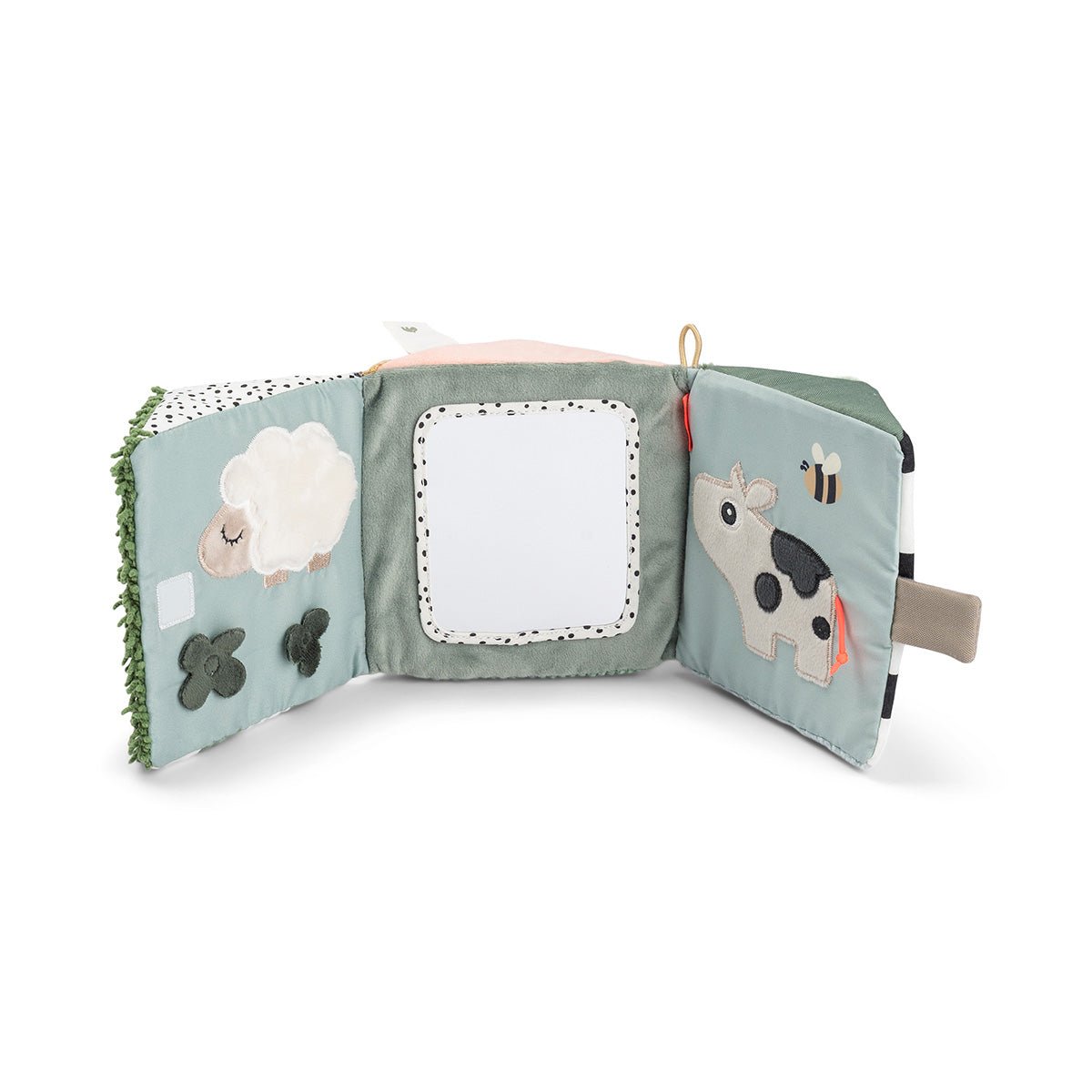 Dankzij het opvouwbare ontwerp kun je hem plat neerleggen voor buiktijd oftewel tummy time, als driehoek laten staan of ophangen waar je kleintje speelt. De felle prints, vriendelijke gezichten en zachte texturen zijn ideaal om de aandacht van baby’s te trekken en hen uit te nodigen om te kijken, aanraken en ontdekken.