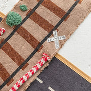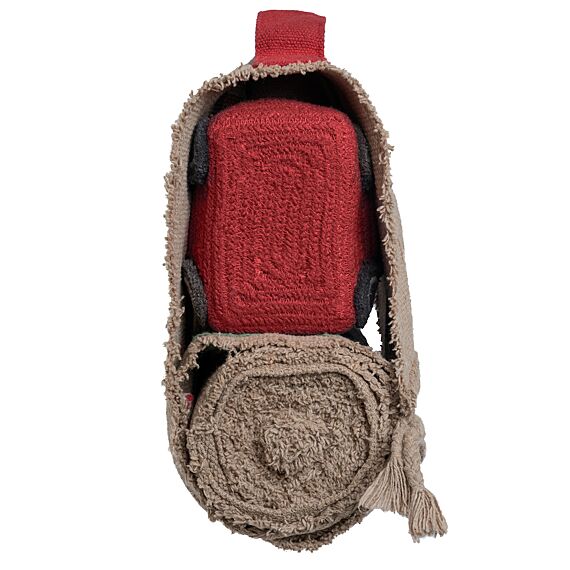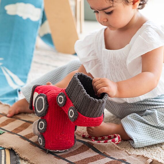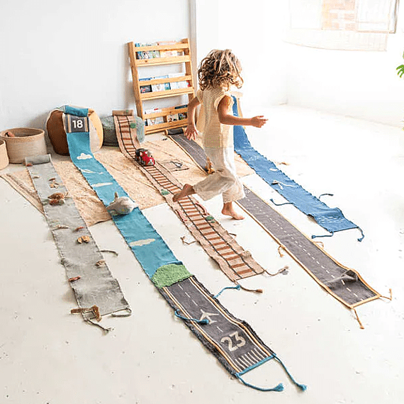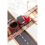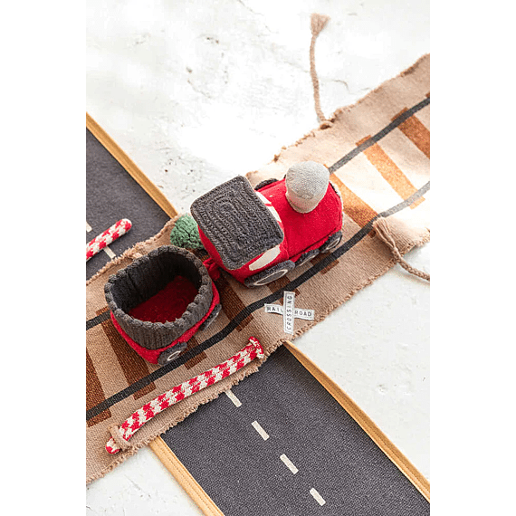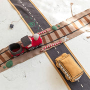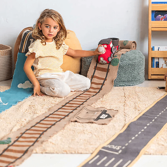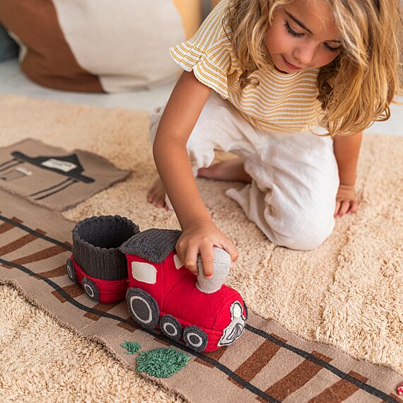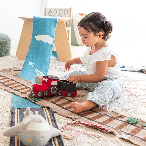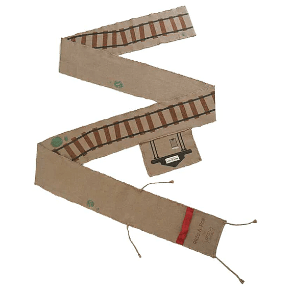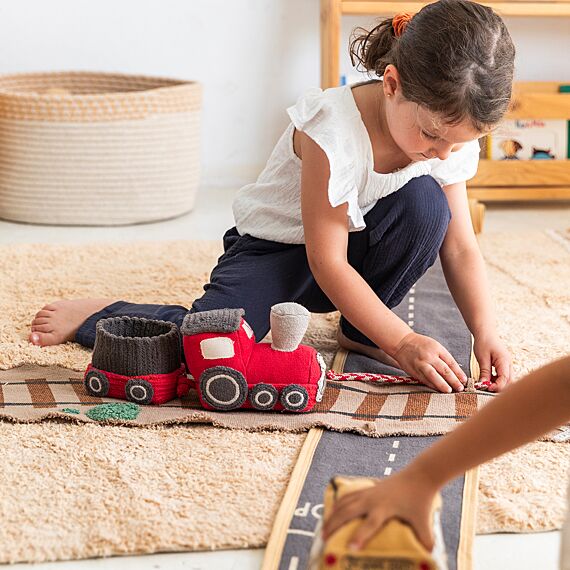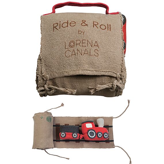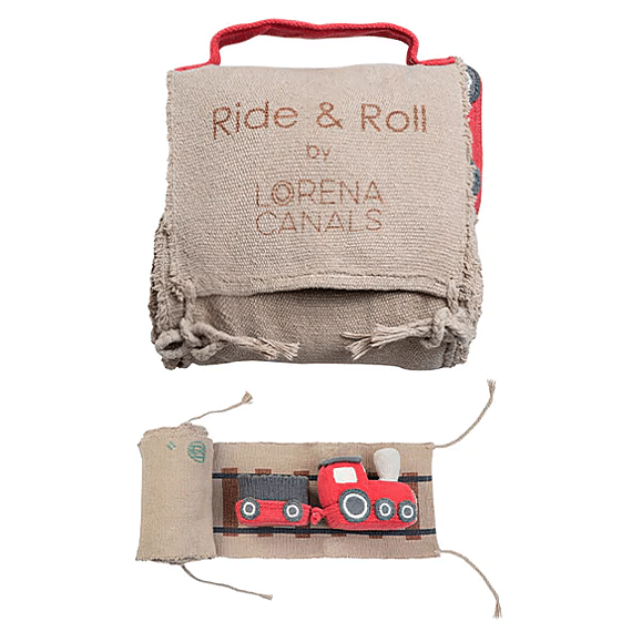 Lorena Canals Ride & Roll Train bestaat uit een zachte rode trein gewikkeld in een 4 meter lange canvas weg met bedrukte treinrails, rood-witte spoorwegovergangen en een station. De speelgoedtrein uit rood katoenen canvas heeft ramen als patches, geborduurde details en donkergrijs gevlochten katoenen koorden als dak. Er zit ook een bijpassende rode wagon bij. Het lange canvas spoor in linnen kleur kan je makkelijk overal uitrollen, het treinspoor is voorzien van bedrukte treinrails, spoorwegovergangen in rood en wit en een treinstation.