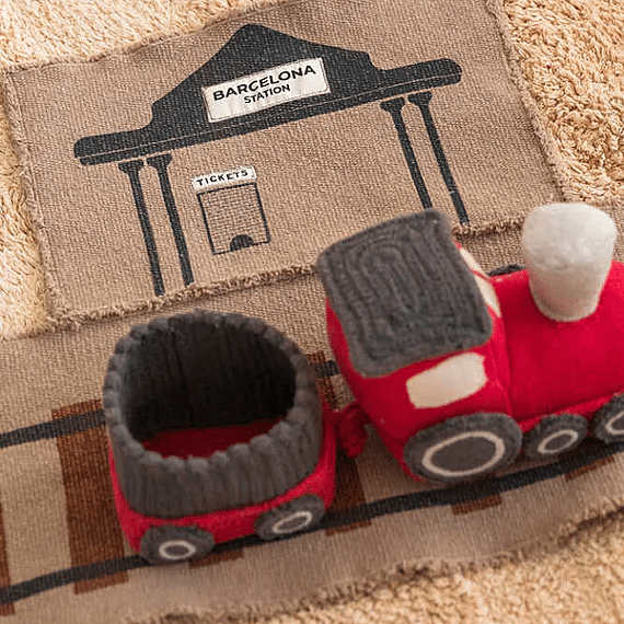 Choo choo, allemaal aan boord van de trein! Volgende halte: Barcelona. De Ride&Roll Train is textielspeelgoed dat met de hand is gemaakt van restjes uit onze eigen fabriek.