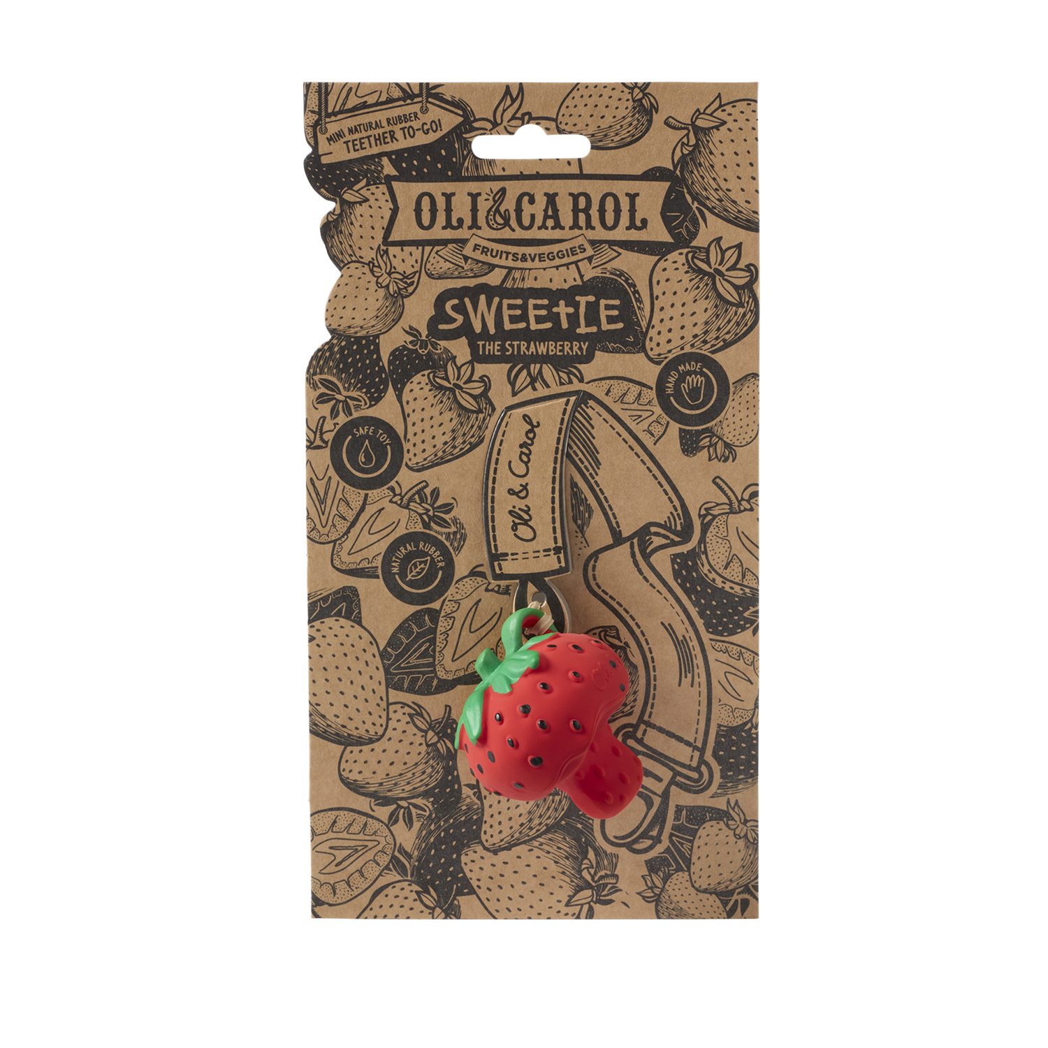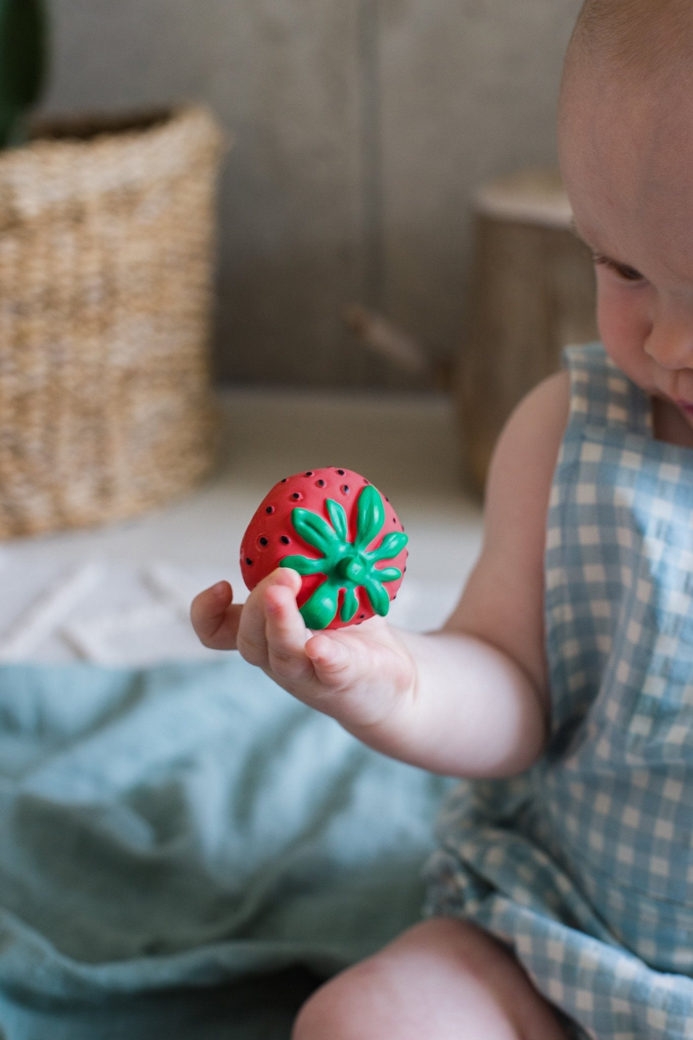 Sommige speeltjes maken je gewoon vrolijk zodra je ze zie: Sweetie the Strawberry Mini Baby Teether van Oli & Carol is er zo eentje. Met haar zachte textuur en opvallende kleuren brengt dit mini bijtspeeltje je meteen in vervoering. Maar achter dat vrolijke uiterlijk schuilt een slim ontwerp: de Strawberry Teether is met de hand gemaakt uit 100% natuurlijk rubber van de Hevea-boom en gekleurd met veilige, natuurlijke pigmenten. Geen plastic, geen gaatjes waar water in kruipt, en dus ook geen kans op schimmel.