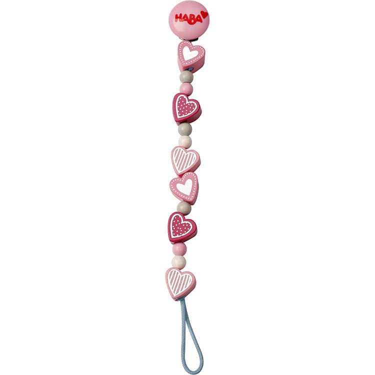 Fijne speenketting met vriendelijke, zachte vormgeving. De speenketting is mooi en netjes afgewerkt en gemaakt van gekleurde houten stukjes van echt beukenhout. De speenketting bestaat uit een roze klem voor aan een shirtje of broekje, diverse roze hartjes met regenboog glimmende effecten, kralen en een cilindervormig blokje met opnieuw kleine glimmende accenten. Zeer mooie speenketting die kwaliteit uitstraalt. Aan het koord aan het uiteinde kan uiteraard de speen worden geknoopt
