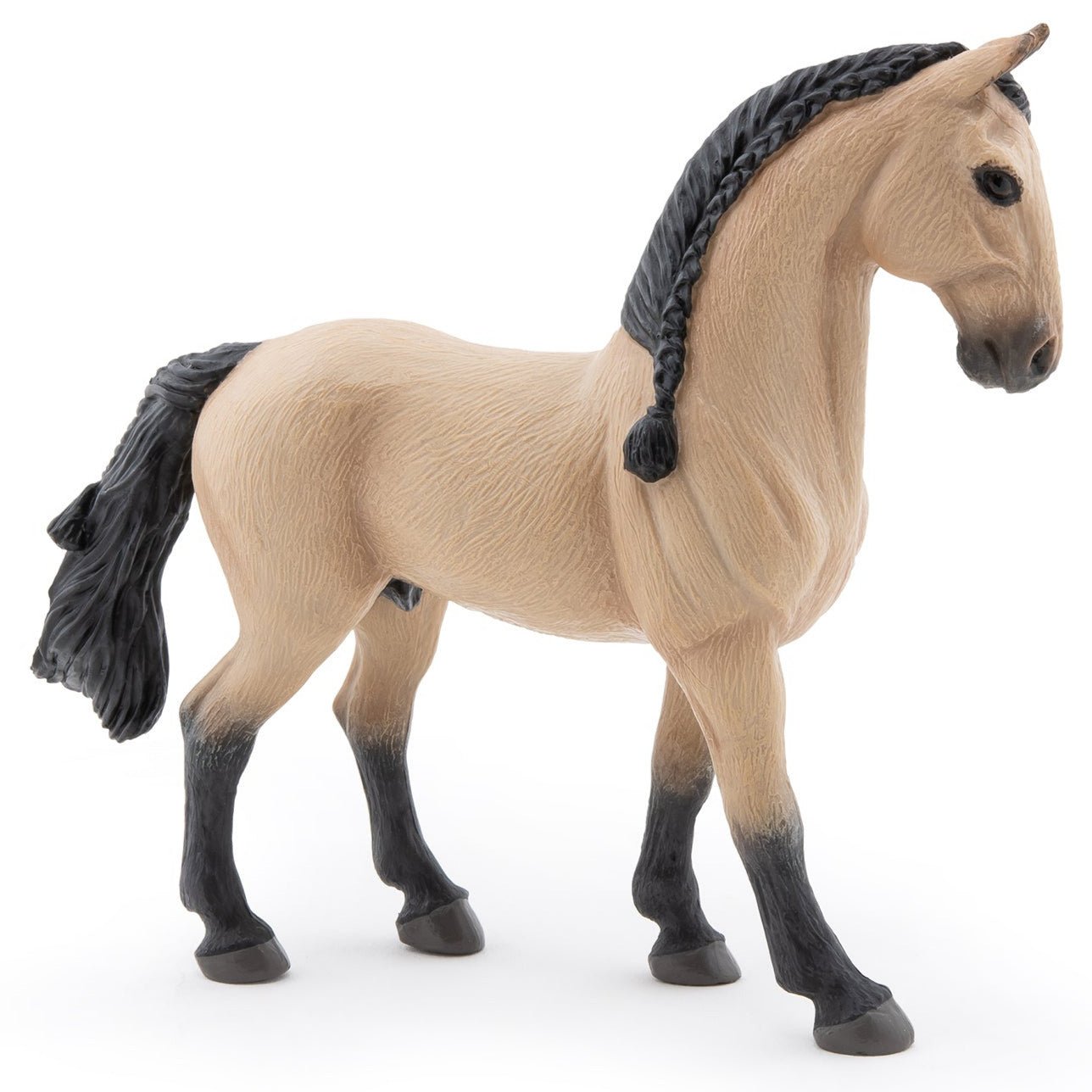 Dit Papo Lusitaans speelfiguur is een realistisch en met de hand beschilderd paard boordevol kracht en elegantie. Het Lusitaanse Portugees paard is een bekend Portugees paardenras, bekend om zijn elegante bouw, lenigheid en vaak gebruikt in dressuur en traditionele paardensporten.