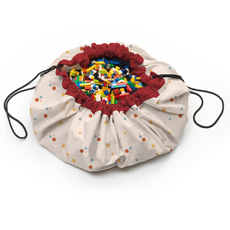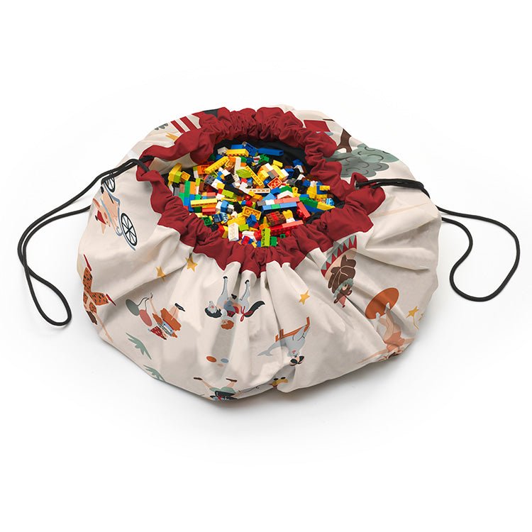 Play and Go Circus toy storage bag Noomad Original is heerlijk speelgoed / opbergplek voor na het spelen alles netjes op te ruimen. Neem je favoriet speelgoed mee op avontuur met deze geweldige speel-/opbergmat met leuke circusprint. De mat is ideaal voor jongens en meisjes van alle leeftijden die hun speelgoed netjes op één plek willen opbergen en aan het einde van de speeltijd kan alles worden verzameld door de verborgen riemen en gespen aan te passen en alles erin op te bergen en gemakkelijk te dragen.