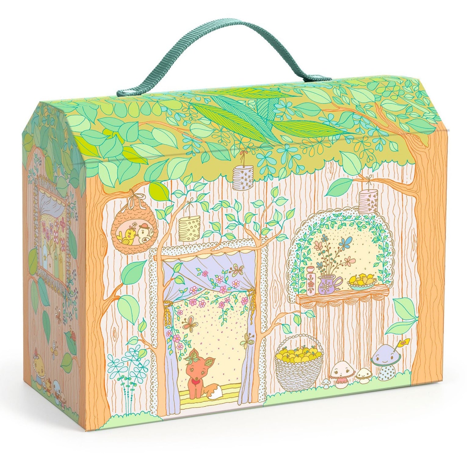 Het draagbaar poppenhuis bestaat uit twee kamers, een keuken, een woonkamer, een tafel en daarbuiten ligt een ontspannend en idyllisch landschap met een rivier. Op die manier kan je echt contact maken met de natuur!
