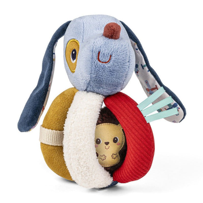 Sommige vriendschappen beginnen met een glimlach en een rinkelend geluidje. Jules de hond gaat nooit op pad zonder zijn kleine maatje Léon de egel. Deze grote zachte rammelaar met handvatten Jules van het Belgische Lilliputiens nodigt de allerkleinste speelvogels uit om te grijpen, luisteren en voelen.
