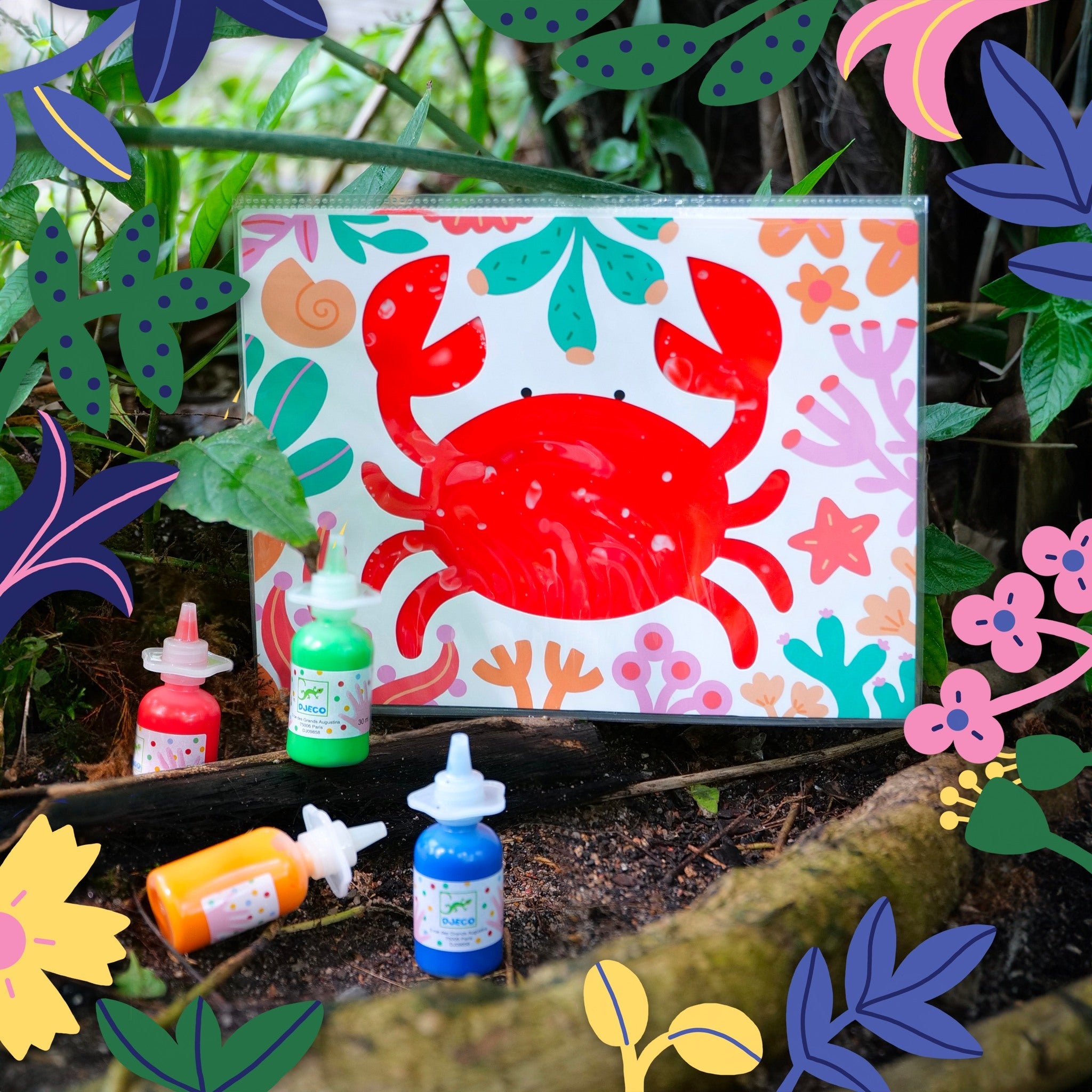 • Inhoud: 4 geïllustreerde, geplastificeerde en afwasbare mapjes, 4 flesjes plakkaatverf (rood, oranje, blauw en groen) en 1 boekje met stap-voor-stap uitleg.