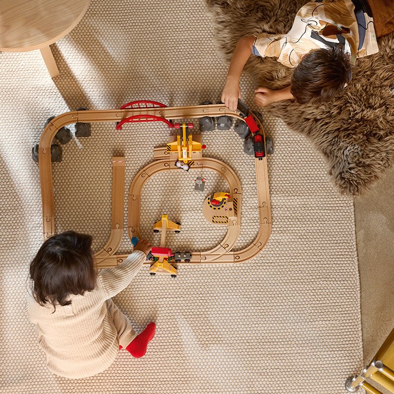 Ook aan de details is gedacht: een zachte speelmat van Lorena Canals als landschap, leuke voertuigen van Siku of zelfs magnetische of educatieve uitbreidingen van Smart en Djeco. Alles zorgvuldig geselecteerd voor kinderen die houden van bouwen, rijden, fantaseren én verhalen verzinnen.