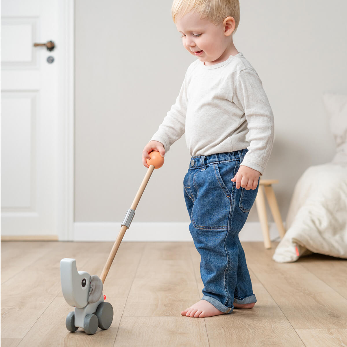 Het stevige houten ontwerp van dit houten duwspeelgoed voelt stabiel en veilig aan, perfect voor nieuwsgierige peuters die de wereld willen verkennen. De zachte grijstint en het herkenbare Scandinavische design maken dit duwspeelgoed niet alleen leuk om mee te spelen, maar ook mooi in huis.