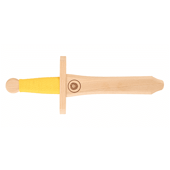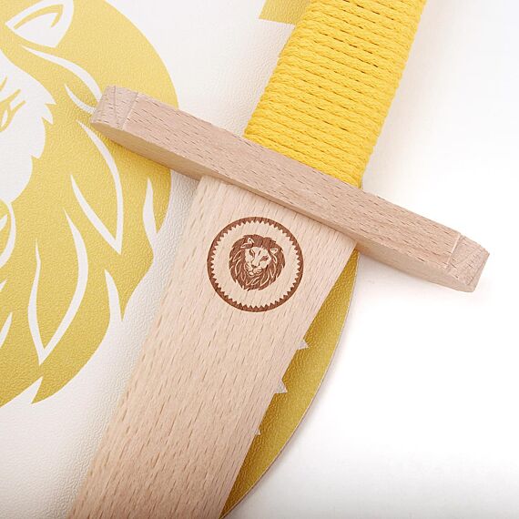 Leopold is een geweldige houten zwaard en schild speelset van VAH gemaakt van hoogwaardig hout. Het ronde schild heeft een geel Leeuwenmotief op een lichtgekleurde achtergrond en gele kartelrand. Het heeft natuurlijk een comfortabel handvat, dat is vastgeklonken van imitatieleer. Het handvat van het zwaard is omwikkeld met rood gevlochten katoenen touw. Een bijzonder detail is het gegraveerde schip op het zwaard, passend bij het schild.