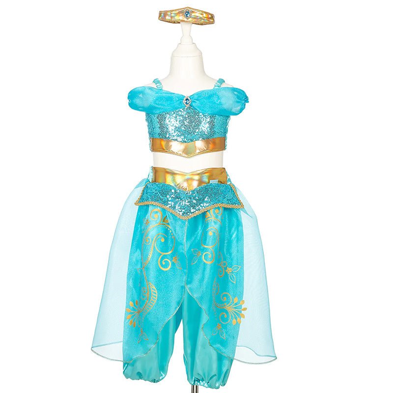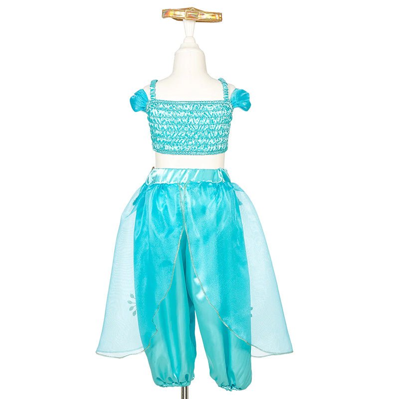 De Amira-verkleedset bestaat uit een soepel vallende broek, een topje met sprankelende details én een bijpassende hoofdband die dankzij het verstelbare klittenband perfect blijft zitten, ook tijdens de meest energieke dansmoves. De set is uitgevoerd in een diepe turkooisblauwe kleur die meteen tot de verbeelding spreekt: een kleur die iets mysterieus en magisch oproept.