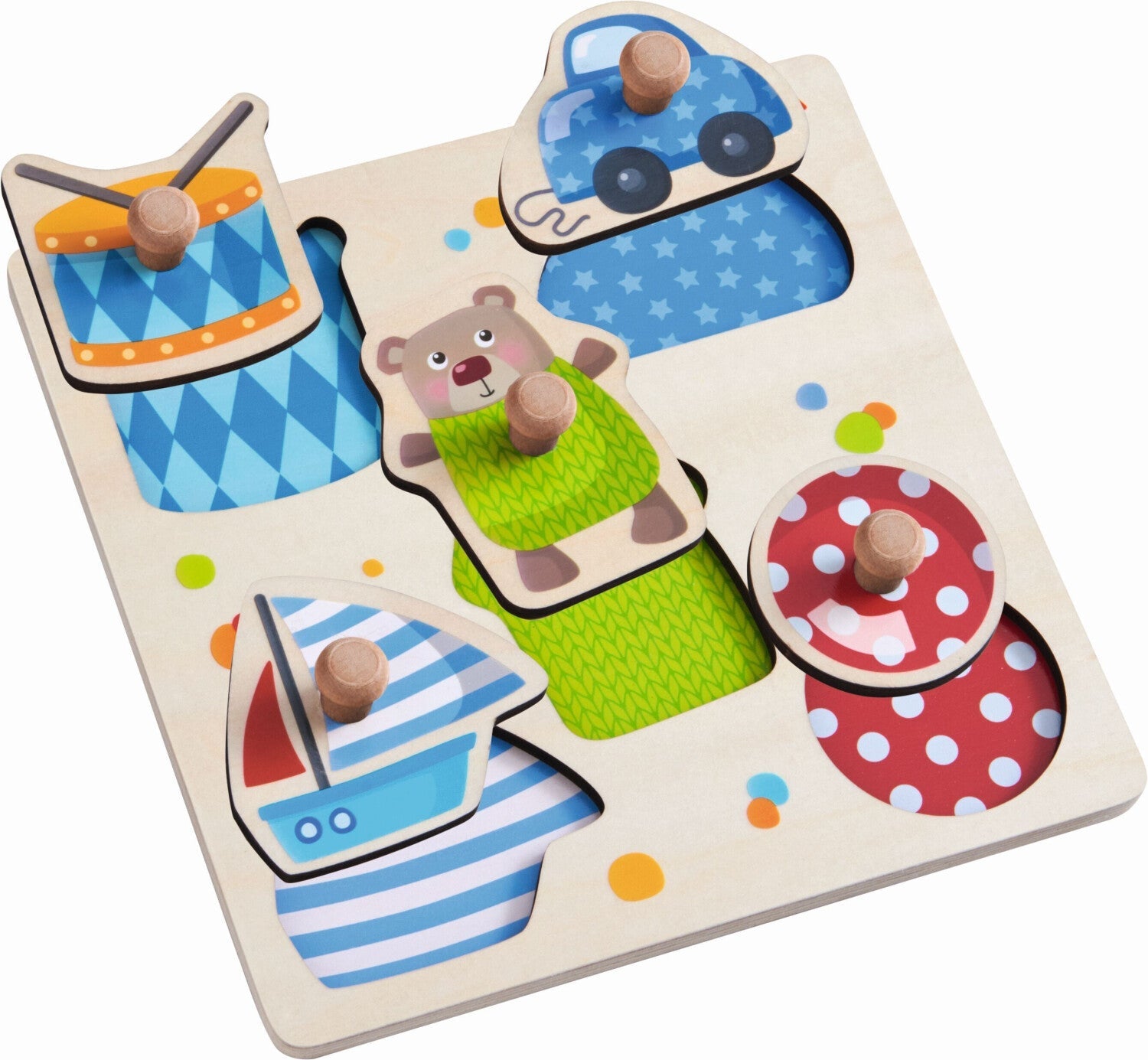 Leer puzzelen met de houten inlegpuzzel Speelgoed uit de collectie van Haba. Vormen, kleuren, motieven... je kleintje kan eindeloos (leren) puzzelen en de fijne motoriek oefenen met deze houten eerste kleuterpuzzel met 5 stukjes.