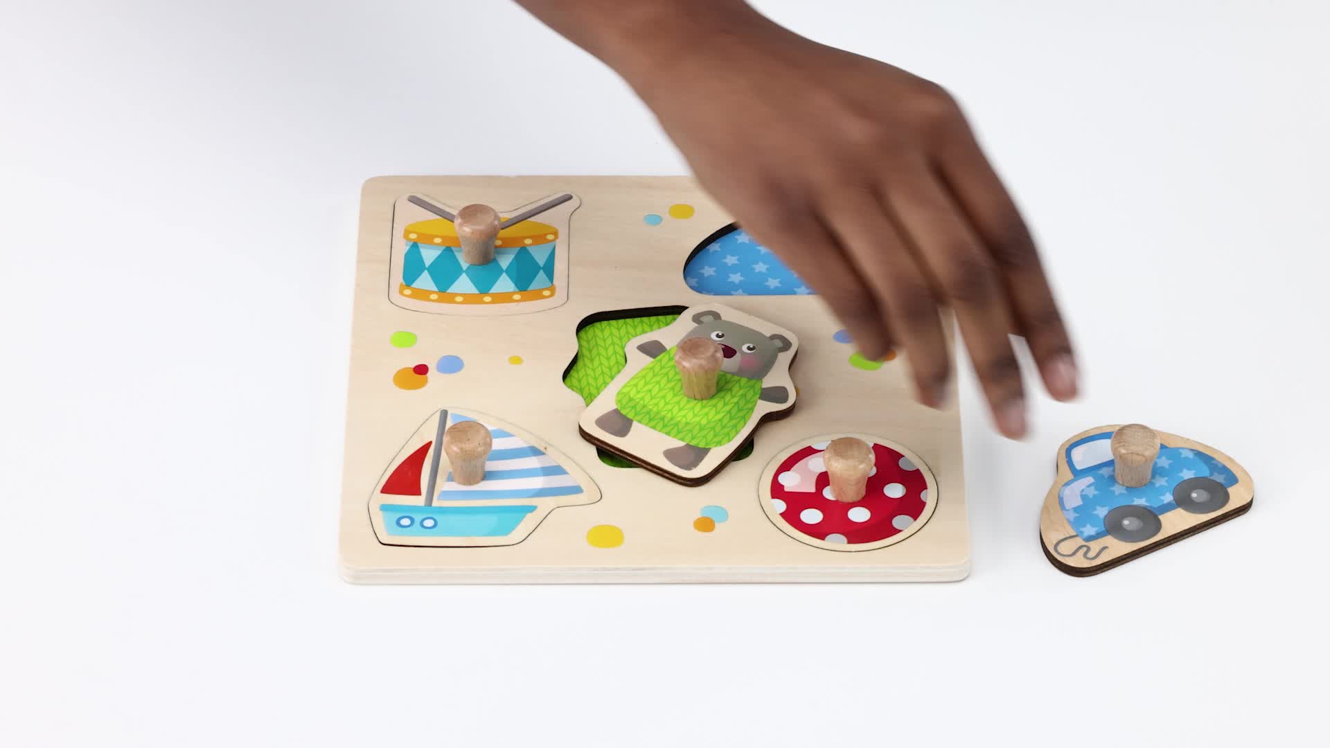 Elk puzzelstuk is voorzien van een stevige knop die mooi past tussen kleine vingertjes.