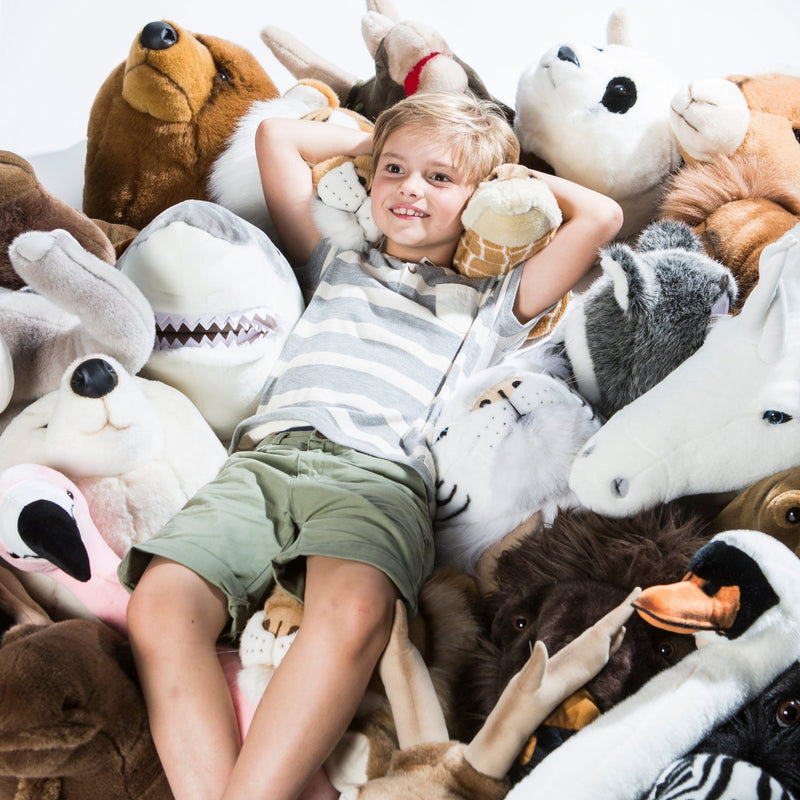 Naast de zachte dierentrofee hoofden wordt deze collectie elk seizoen beestiger: met knuffelrugzakken, scooter heads, zitzakken, de populaire zachte dierencapes - altijd een hit tijdens carnaval en op menig verjaardagsfeestje - die je ook als tapijt kan gebruiken, springdieren, stokdiertjes, knuffeltjes en meer.