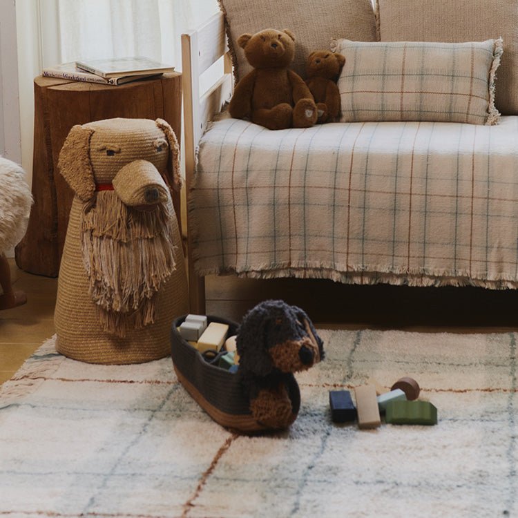 Handgemaakte Basket Sparky uit de Wouf Wouf collectie van het Spaanse Lorena Canals is een geweldig stukje kinderkamer deco met de handgemaakt en leuke opbergplek voor je blokken, speelfiguren, autootjes en ander klein speelgoed in de kinderkamer of speelplek van je kleine kapoen.