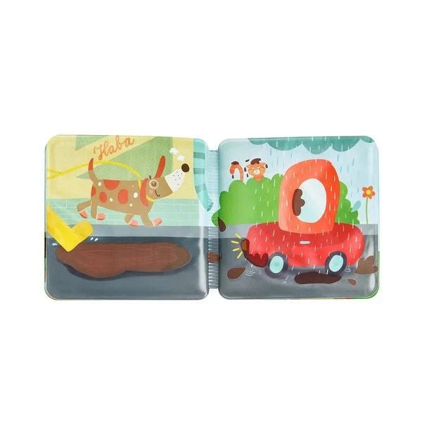 This magical little bath book, "Wash Day, Bye Mud!" from the Haba collection, is perfect for bath time. The baby book is waterproof, and the various drawings on the pages transform in the water. When the book is submerged in warm water, the mud on the pages disappears. Pure magic!