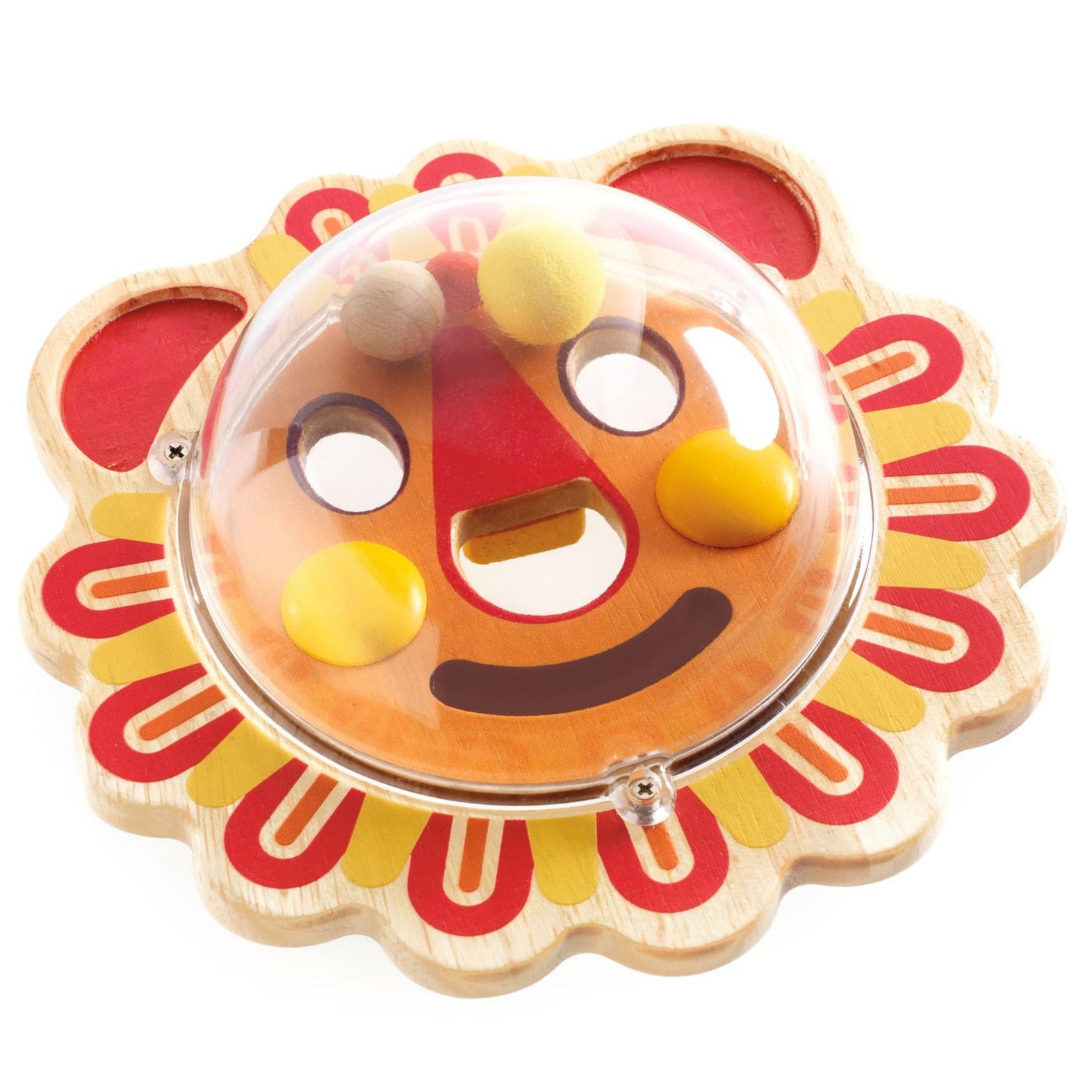 Contents: 1 wooden and plastic ball with 3 wooden and plastic marbles.