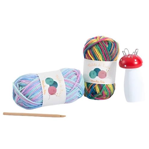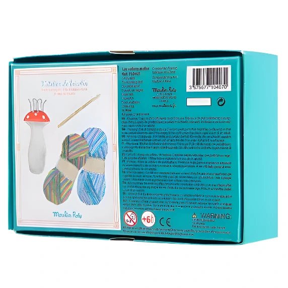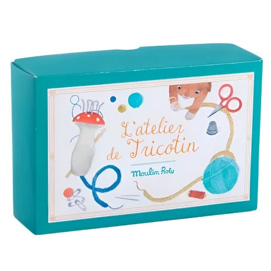 Moulin Roty's L'Atelier de Tricotin is a charming knitting kit with a wooden bobbin, easy instructions for creating your own knitting project, and two balls of yarn, presented in a nostalgic, illustrated cardboard box with a matte finish.