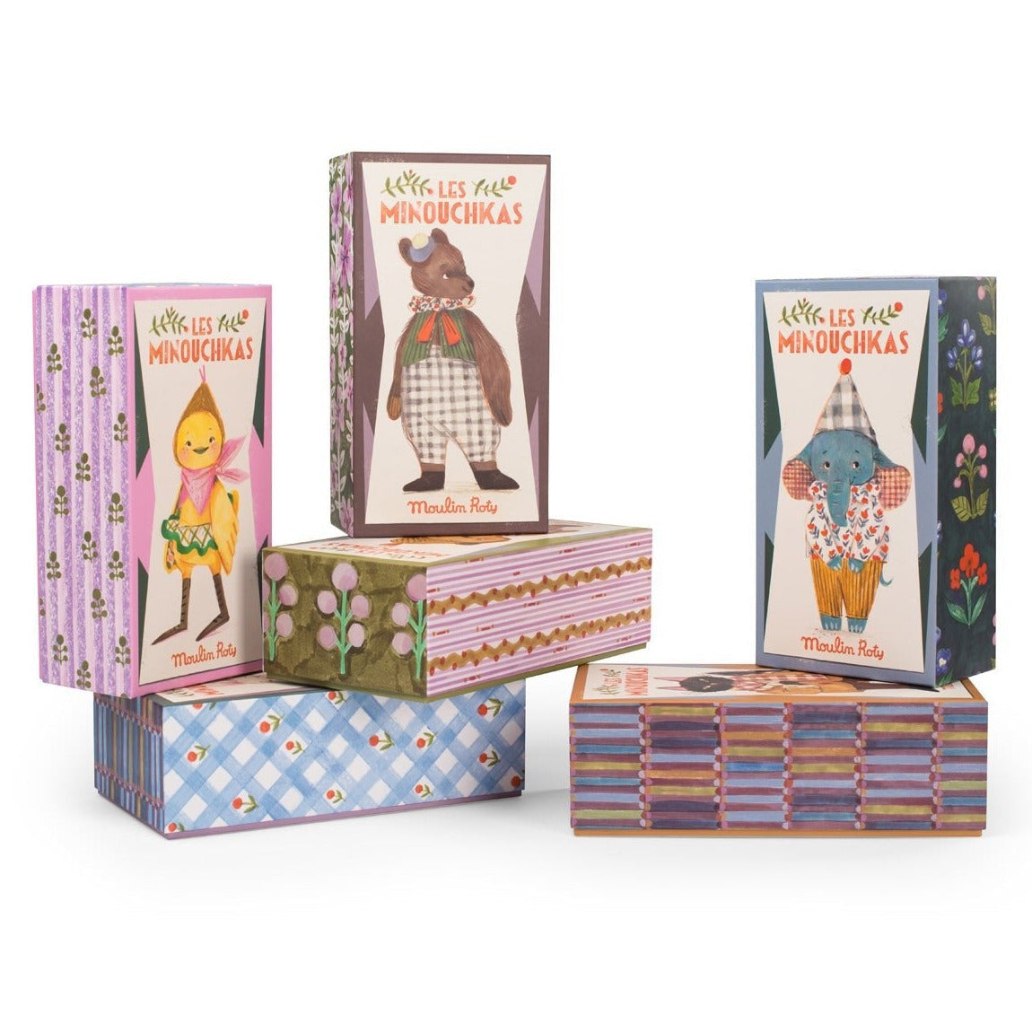 In a charming, imaginary village lives the world of Les Minouchkas by Moulin Roty: warm, playful, and full of little moments that linger. Here, songs are sung, cakes are baked, and every day is filled with friendship and mischievous fun. Nine, the gentle bunny, Léon the clever cat, and their little cuddly friends bring this world to life as beautifully dressed, movable figures in beautifully illustrated boxes .
