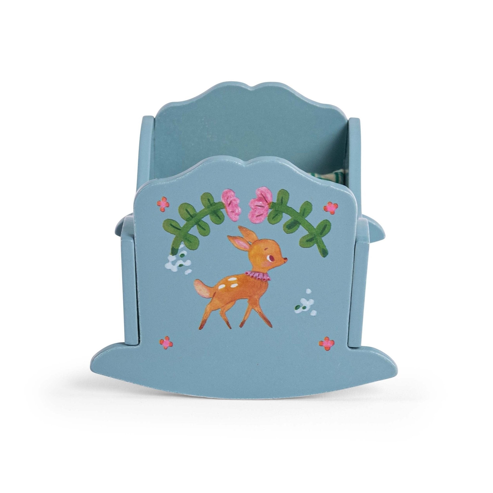 Shhh... little Emile falls asleep, gently rocked by the moonlight. The Les Minouchkas wooden cradle from the Moulin Roty collection is beautifully painted and comes with a checked mattress. Figures are sold separately.
