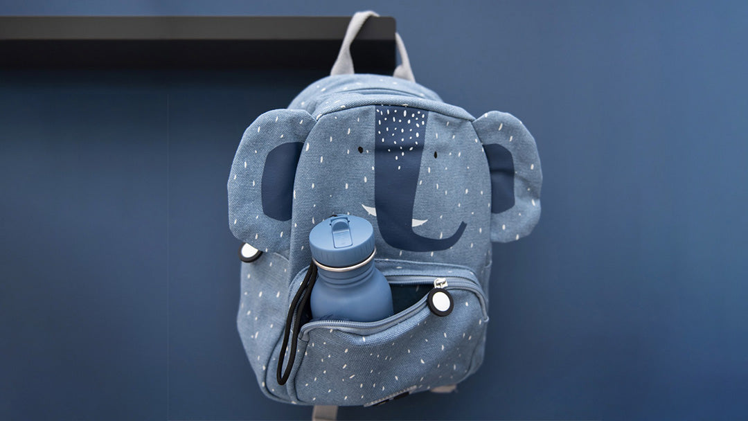 Of course, we're fans of Mrs. Elephant ! This blue elephant is a perfect match for the In den Olifant collection and can be found on the toddler bags, bath capes, water bottles, stacking towers, and plates from the Belgian brand Trixie .