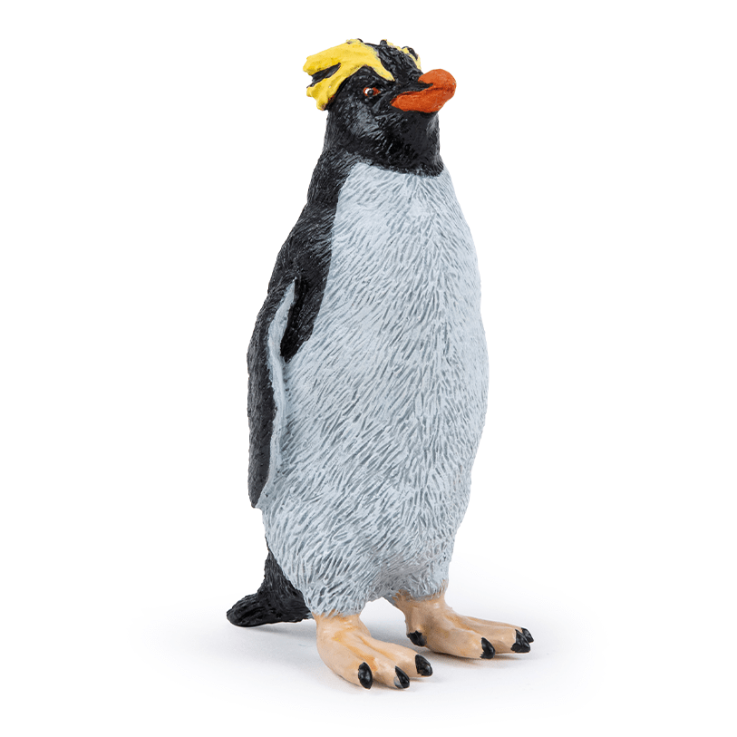 This Papo Macaroni Penguin toy figure is a realistic, hand-painted wild animal from Papo's toy collection. The Gorfou Doré is distinctive for its bright yellow crest that stretches from eye to eye across its head. Despite their striking appearance, macaroni penguins are excellent swimmers and can dive up to 15 meters deep to catch their prey, usually krill, fish, and small squid.