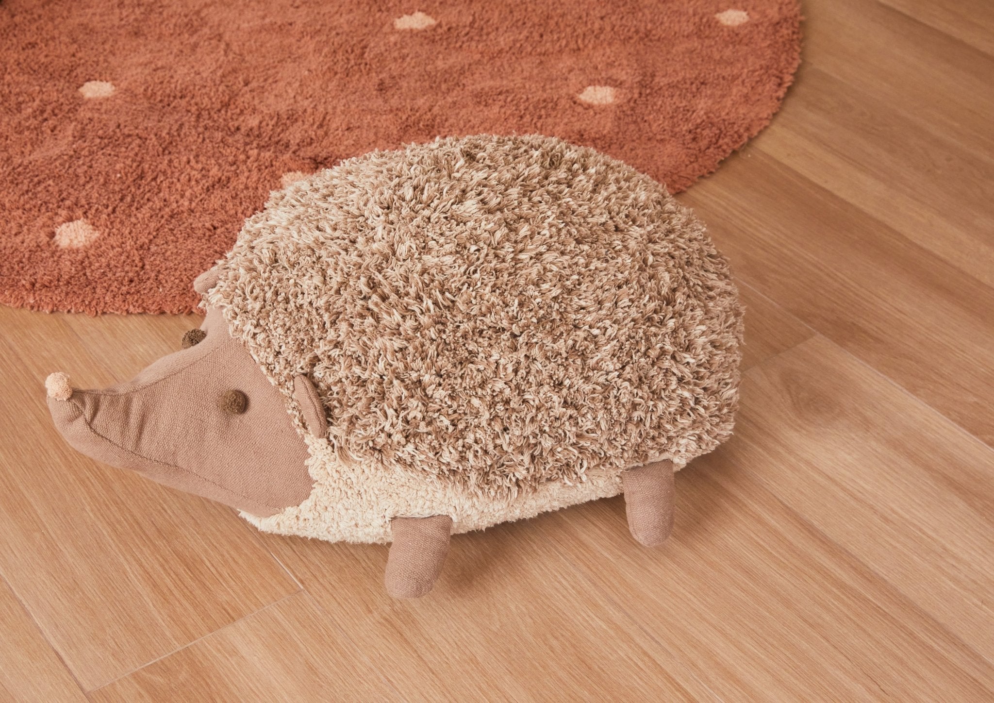 This adorable and curious hedgehog loves to be with children and serves as a playmate, a source of fun, or a comfortable floor cushion! With a back covered in a soft natural-brown blend that mimics the spines, and a fluffy natural-colored belly, the hedgehog floor cushion has tiny feet and ears made of light brown canvas and pom-poms for eyes and nose. It's filled with soft polyfill.