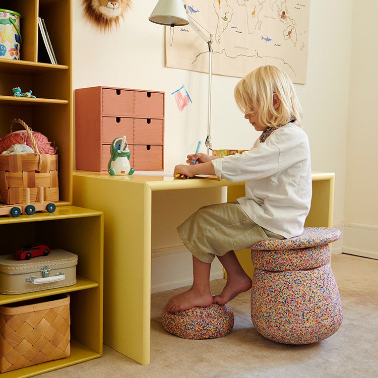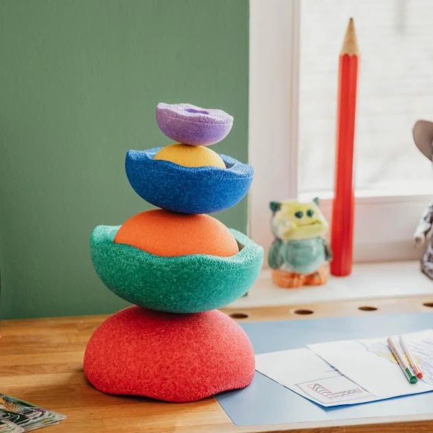 This complete Stapelstein set includes all the elements that come together, a total of 10 pieces that fit together and allow you to create a variety of things. It's a magical tower of color that creates a beacon of wonder in the living room, classroom, or office. One moment you're stacking the Originals and Inside sets into a height-adjustable stool that grows with your child (or provides an active workspace for yourself), the next the elements are scattered like stepping stones across a swirling river of imagination. The addition of the Stapelstein Base and the balance board completes the picture for those who seriously want to work on their balance and motor skills. This open-ended toy is a wonderful example of how design and durability go hand in hand: the material is feather-light yet can support up to 180 kg, making it a true family heirloom that guarantees generations of fun and exercise.
