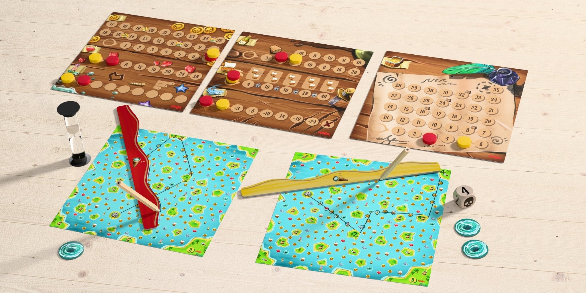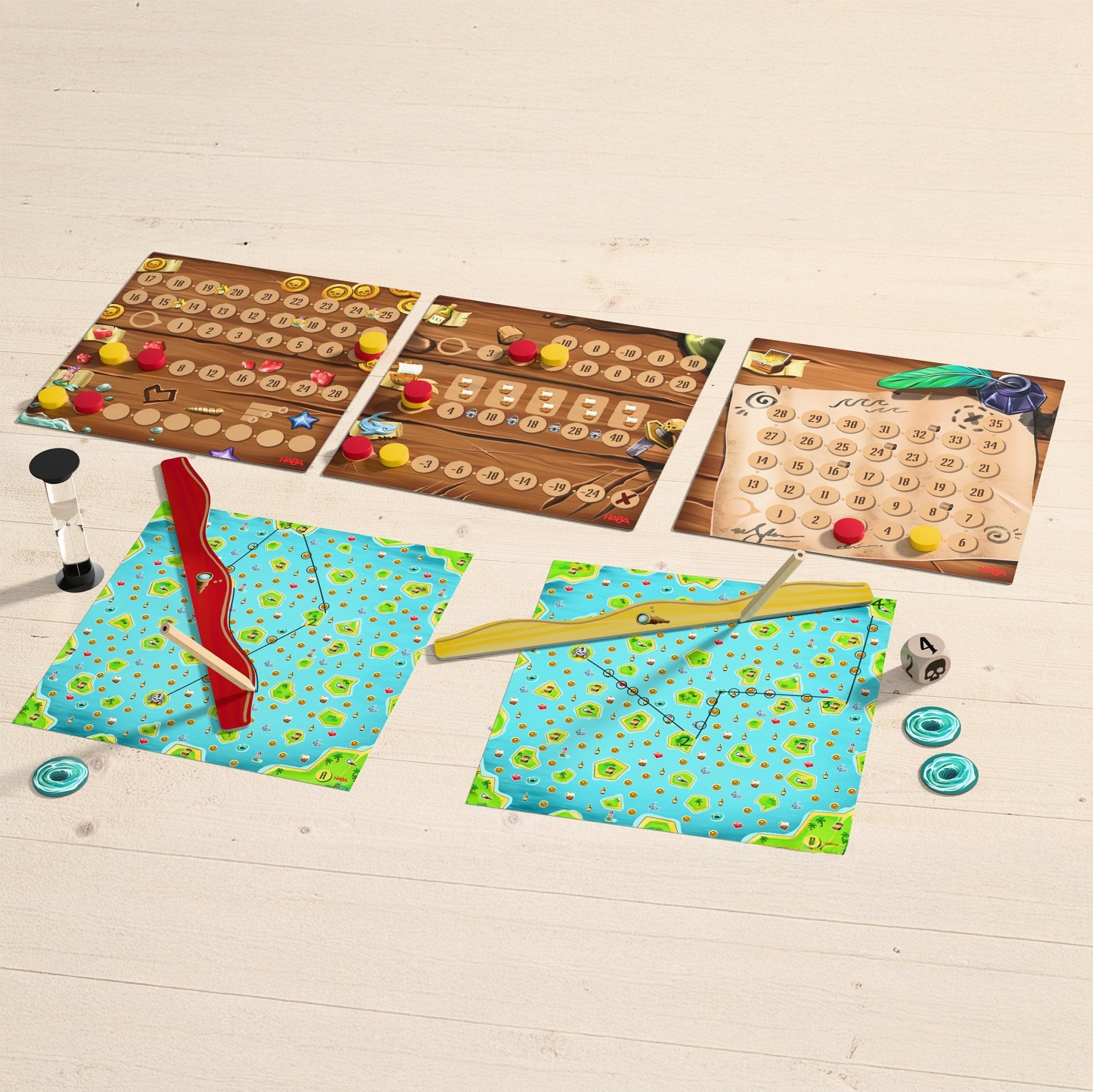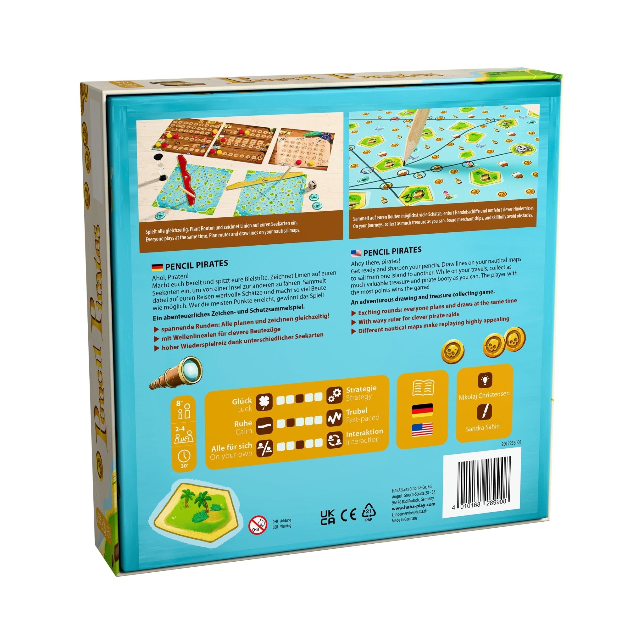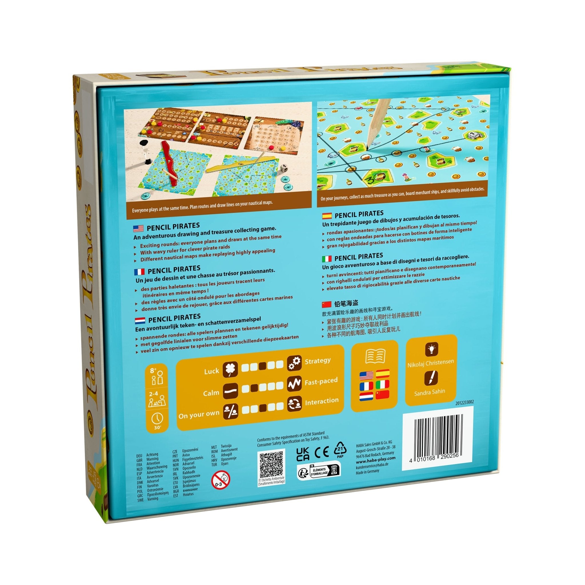 Chasse au trésor sur papier ! À vos crayons ! Embarquez pour une aventure de pirates avec Pencil Pirates de Haba . Tracez des lignes sur la carte et naviguez d'île en île, en capturant – ou en évitant – un maximum de trésors, comme des pièces et des icônes. Le joueur qui totalise le plus de points remporte la partie.