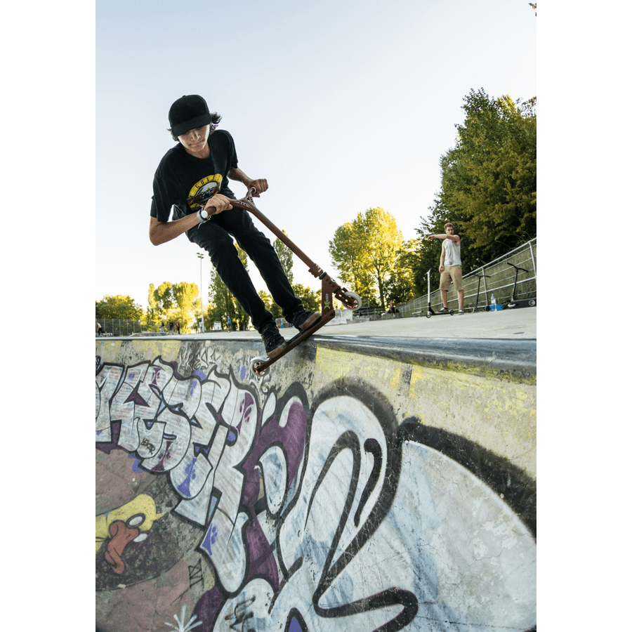 Ce que nous apprécions particulièrement : cette marque suisse, comme nous, privilégie la durabilité. Chaque pièce de cette trottinette freestyle est remplaçable, du grip au frein, ce qui lui assure une longue durée de vie et une réparation parfaite en cas de besoin. Les enfants grandissent, mais la qualité évolue avec eux.