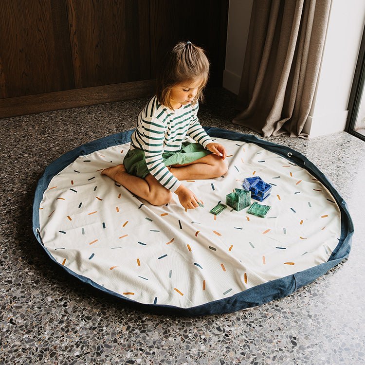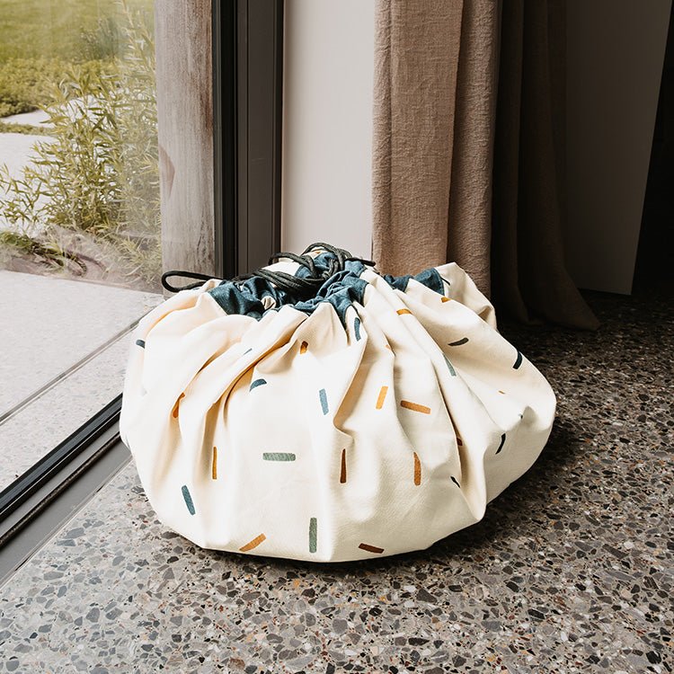 • Deze confetti speelmat wordt een opbergtas en andersom