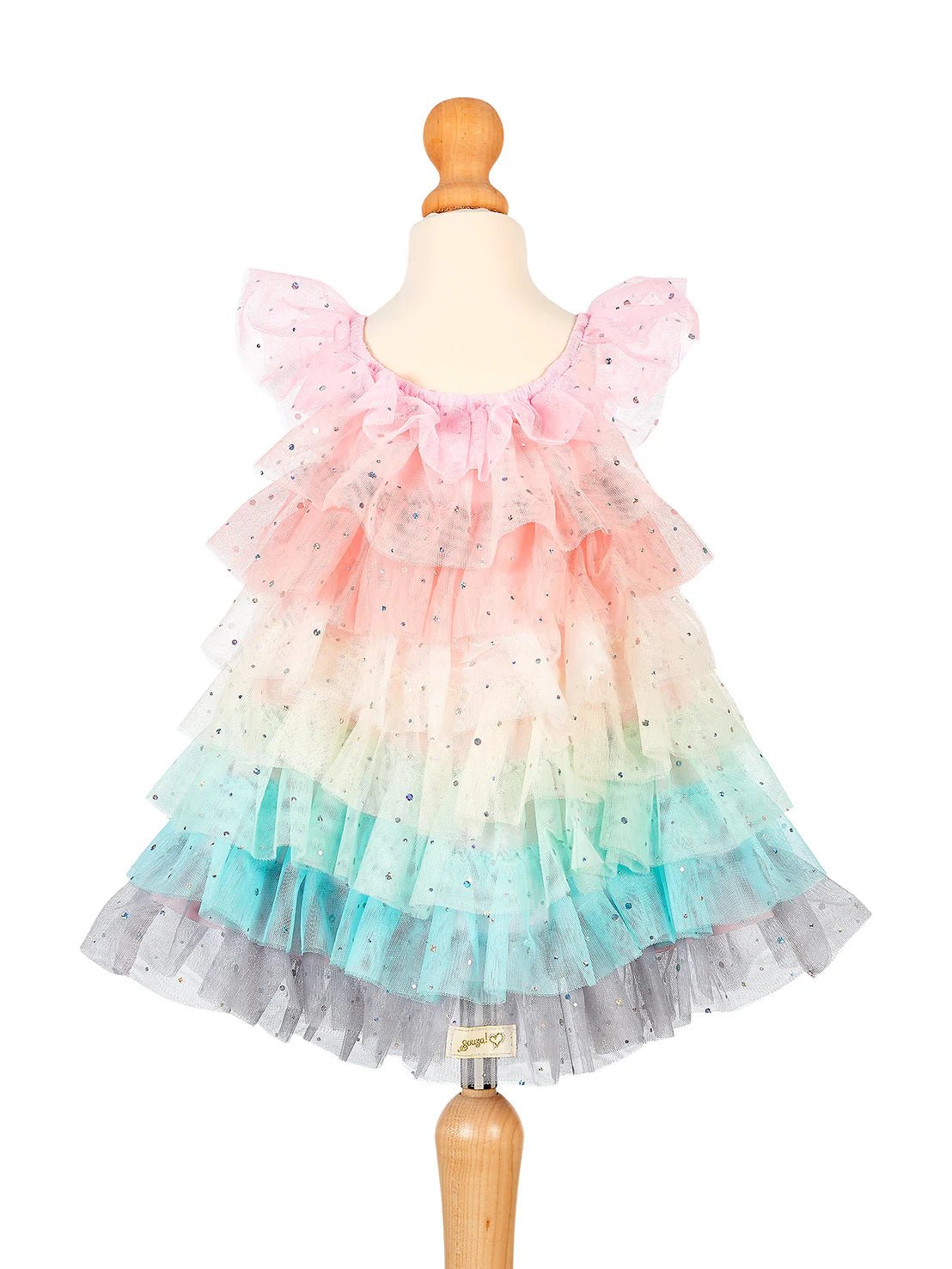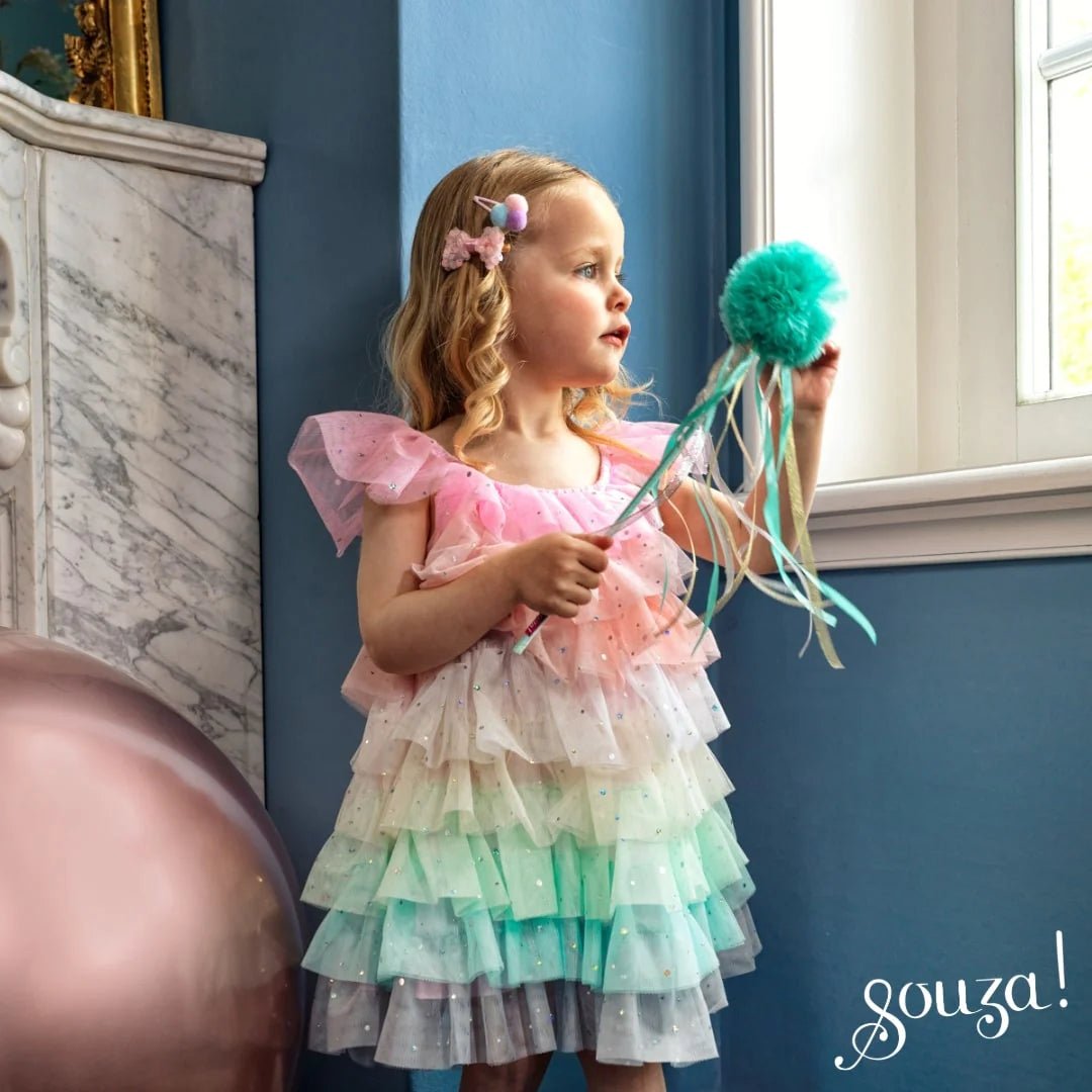 • Laagjes verkleedjurk met pastel regenboogkleurtjes