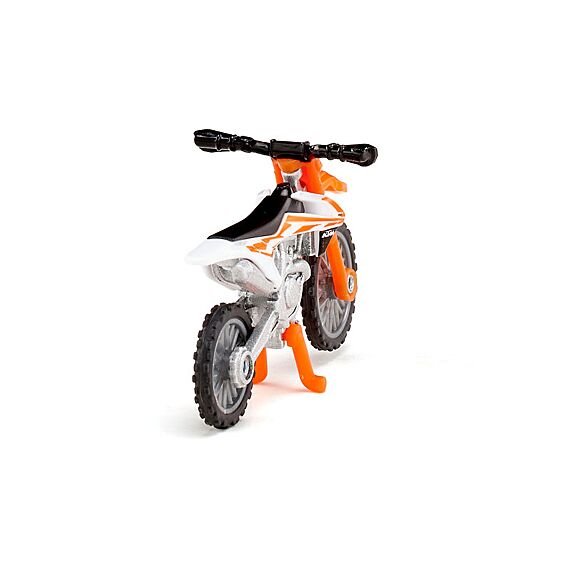 Kapot gereden straten, grindpaden, door de modder en over stenen: dat is het terrein voor de KTM SX-F 450 uit de Siku collectie. Met de typische klank van een ééncilinder motor knettert de KTM door onherbergzaam terrein. Het SIKU model in de KTM-kleuren is uitgerust met een bestuurbaar voorwiel en een dubbele standaard. De nieuwe KTM SX-F 450 is de nieuwste uitbreiding van het SIKU assortiment voor motorfans. In de garage staan al de BMW R1200 GS (1047), de KTM 1290 Super Duke R (1384) en de Ducati Panigale 1299 (1385).