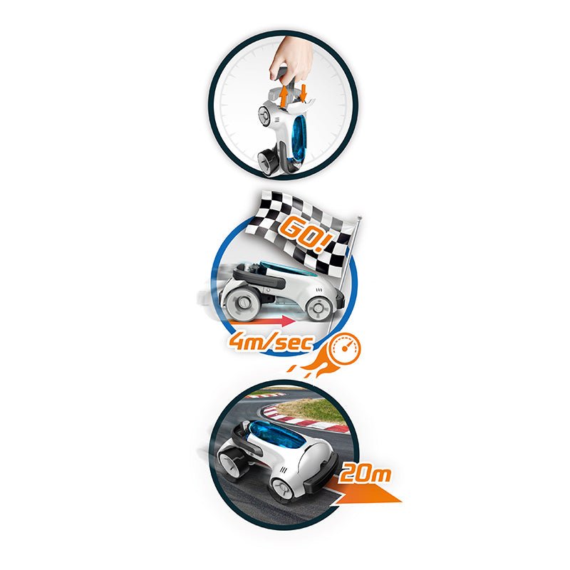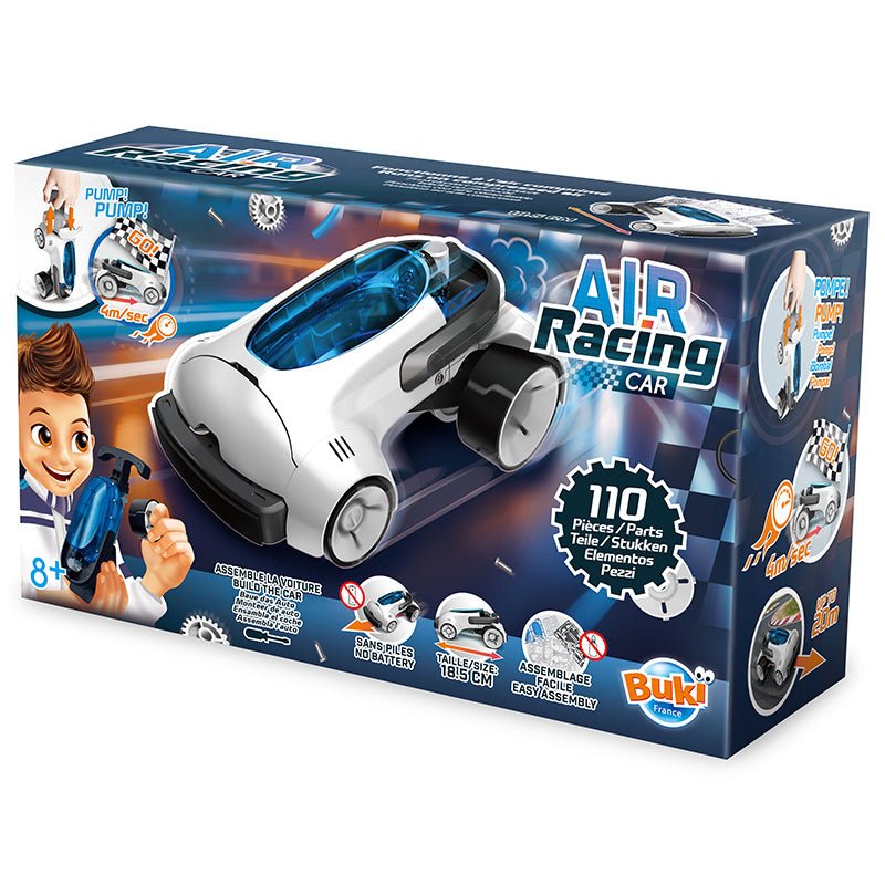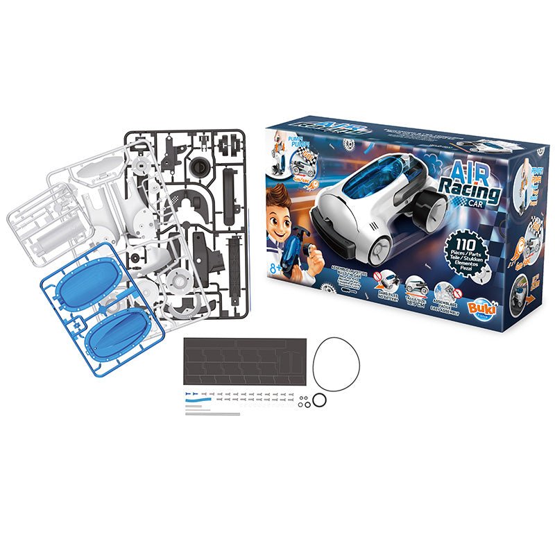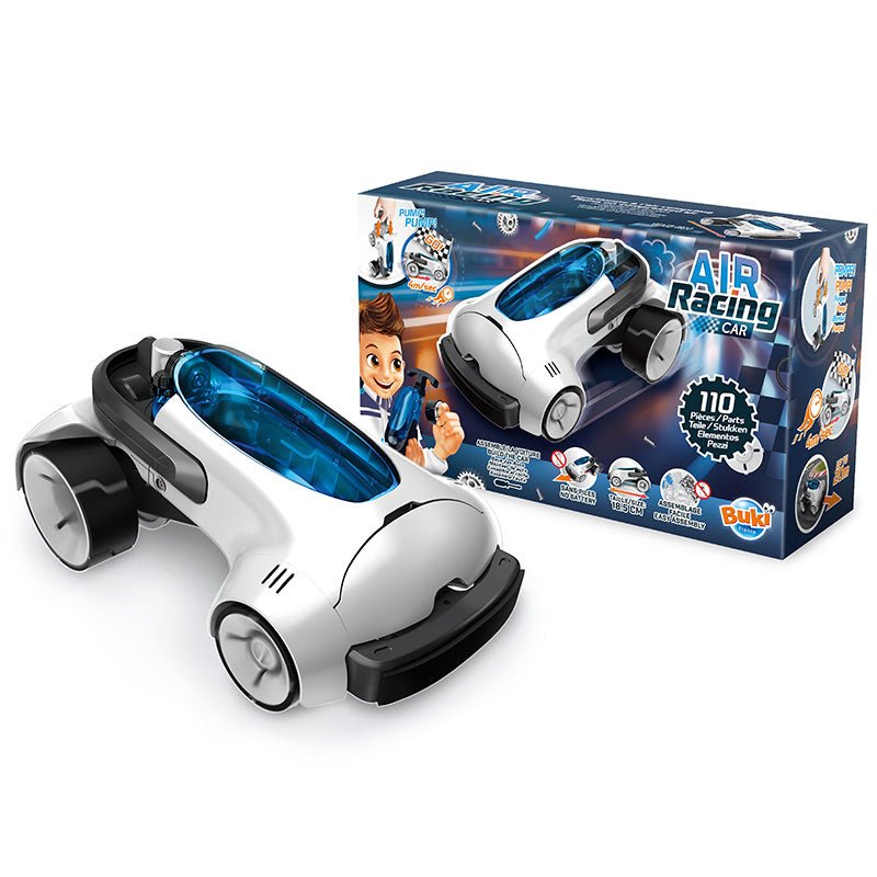 La voiture de course aérienne de Buki est un jouet interactif pour les passionnés d'automobile. Cette voiture futuriste fonctionne à l'air comprimé : écologique et spectaculaire ! Construisez votre propre bolide. Après 14 coups de pompe, elle file à 4 m/s, jusqu'à 20 mètres. Le parfait mélange de technologie, de vitesse et de fun. Construisez, gonflez et foncez !