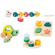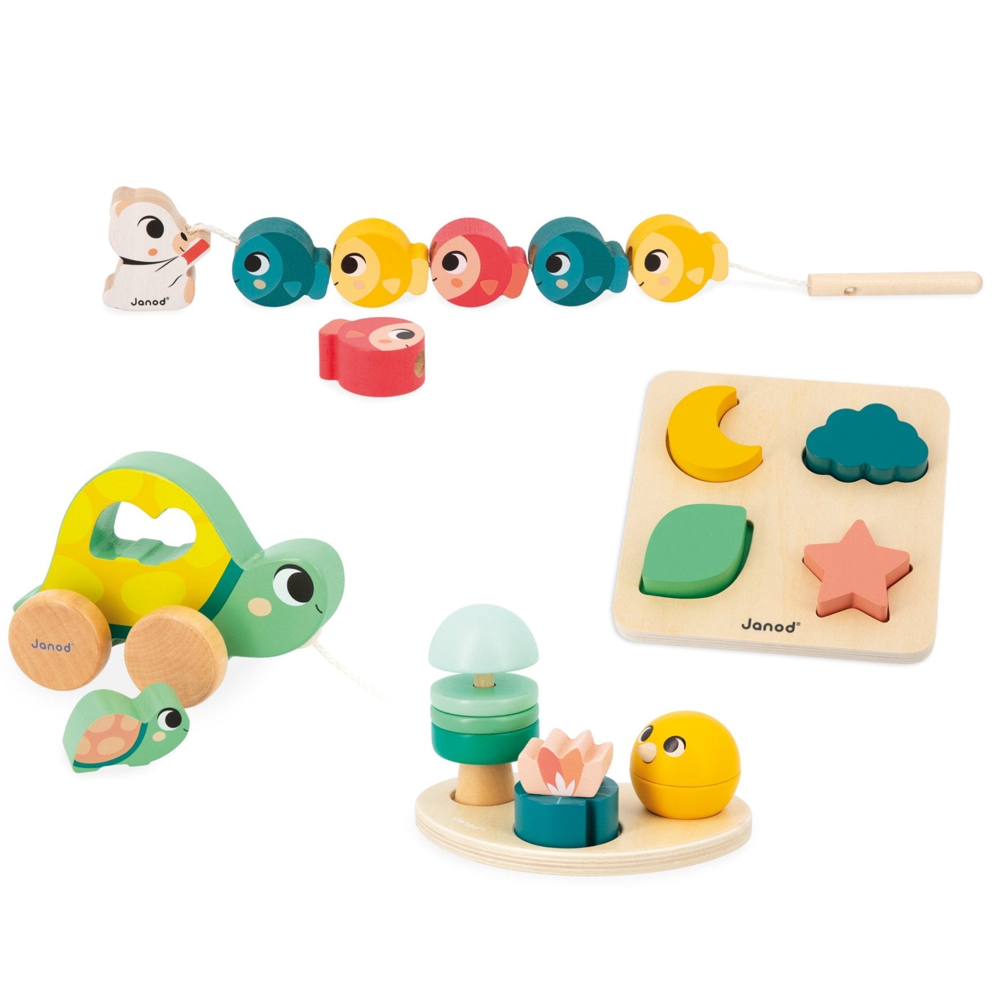 Ce coffret cadeau contient quatre jouets en bois parfaitement adaptés aux capacités et aux intérêts des enfants dès 18 mois. Le premier est une tortue à tirer et son bébé : le bébé tortue est amovible, permettant ainsi aux tout-petits de jouer avec la maman tortue de deux façons différentes : en tirant sur la ficelle ou en la tenant par la carapace. Le jouet à tirer idéal pour encourager votre enfant à bouger et à faire ses premiers pas !