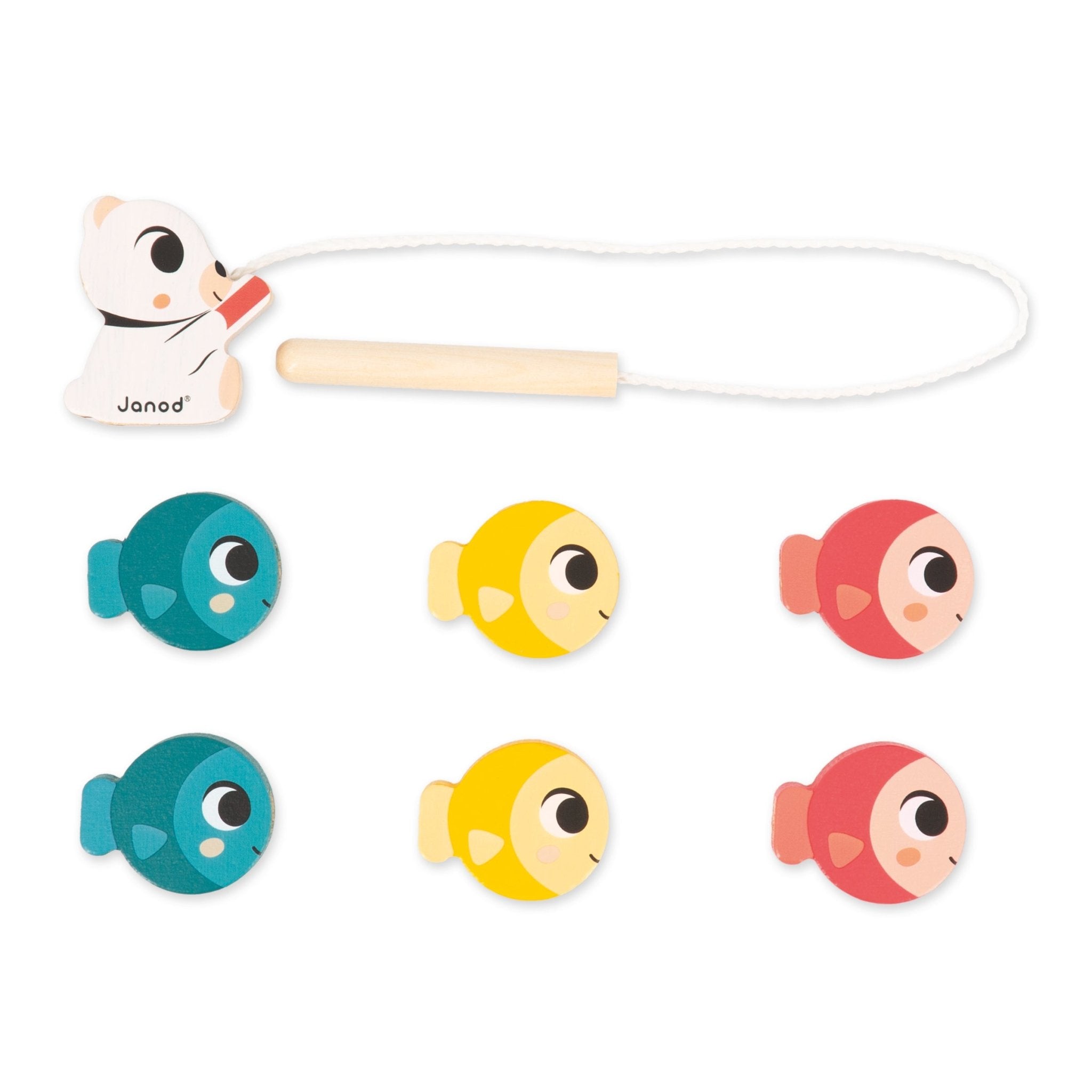 2. Le deuxième jouet comprend un jeu d'enfilage avec 6 perles en forme de poisson, fabriquées en bois robuste : on dirait que notre ami l'ours a passé une belle journée au lac ! L'aiguille en bois au bout du cordon facilite l'enfilage des perles.