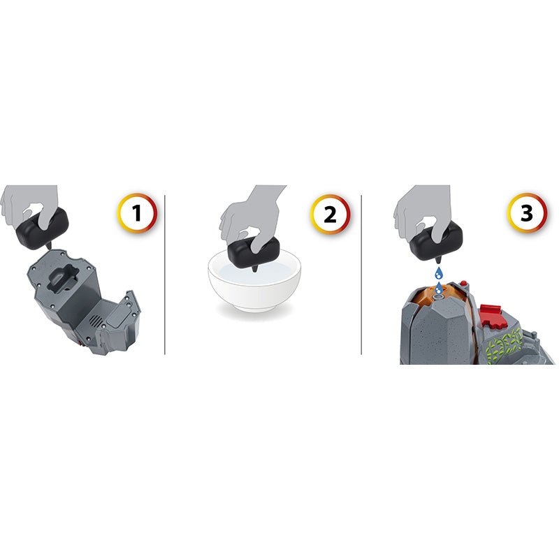 Contenu du coffret : 1 volcan fonctionnel avec fonction d'éruption, 1 figurine de T-Rex, 1 figurine de Ptéranodon, 1 lot d'œufs de dinosaures, 1 réservoir d'eau rechargeable pour la vapeur